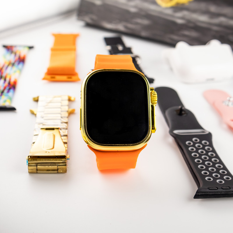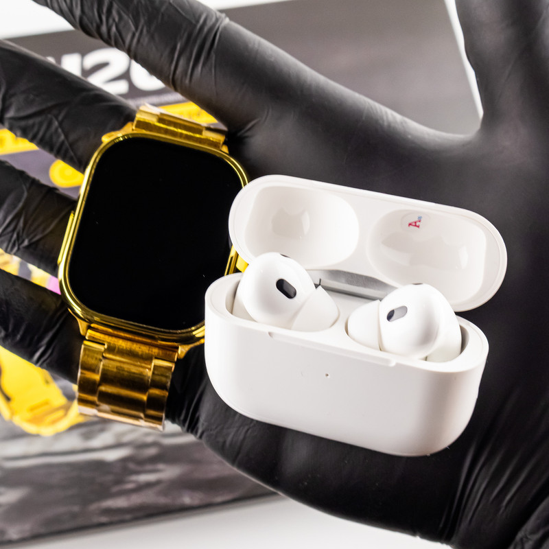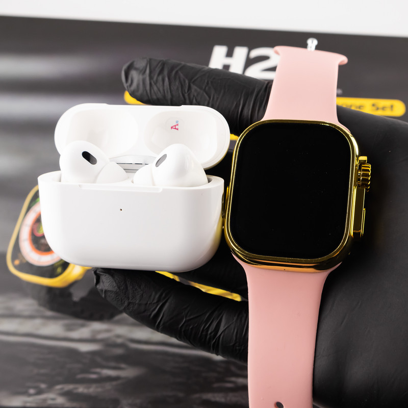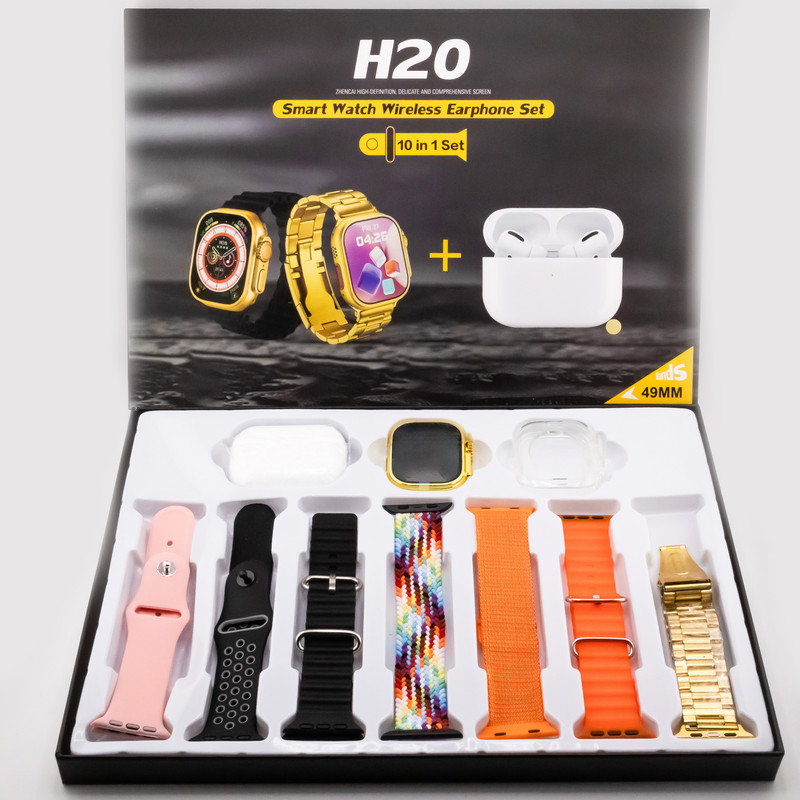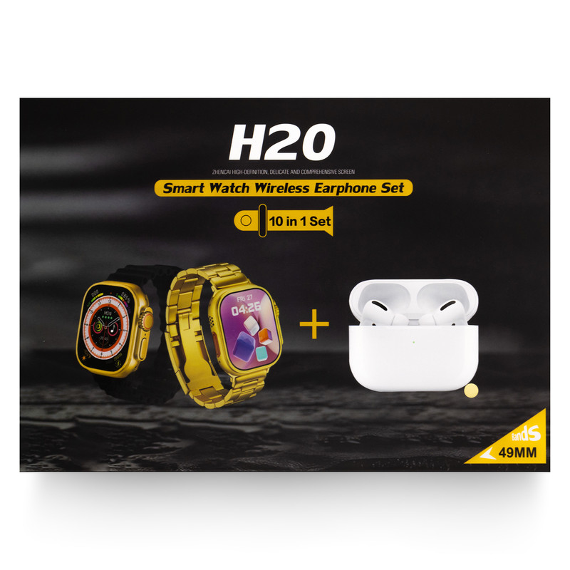 ساعت هوشمند مدل H20 ULTRA به همراه ایرپاد پرو ، یک پک کامل و با کیفیت از ساعت الترا و ایرپاد است که علاوه بر گارد محافظ ساعت و وایرلس شارژ ، دارای 7 بند جذاب است که شامل یک بند فلزی و چهار بند سلیکونی و یک بند پارچه ای و یک بند کنفی است . این محصول به رنگ طلایی تولیدشده که رنگ بدنه ساعت و بند فلزی داخل پک با یکدیگر ست میشوند . به هیچ عنوان این ساعت را با شارژر فست شارژ ، نباید شارژ کنید و حتما از شارژر های غیر فست شارژ استفاده کنید.