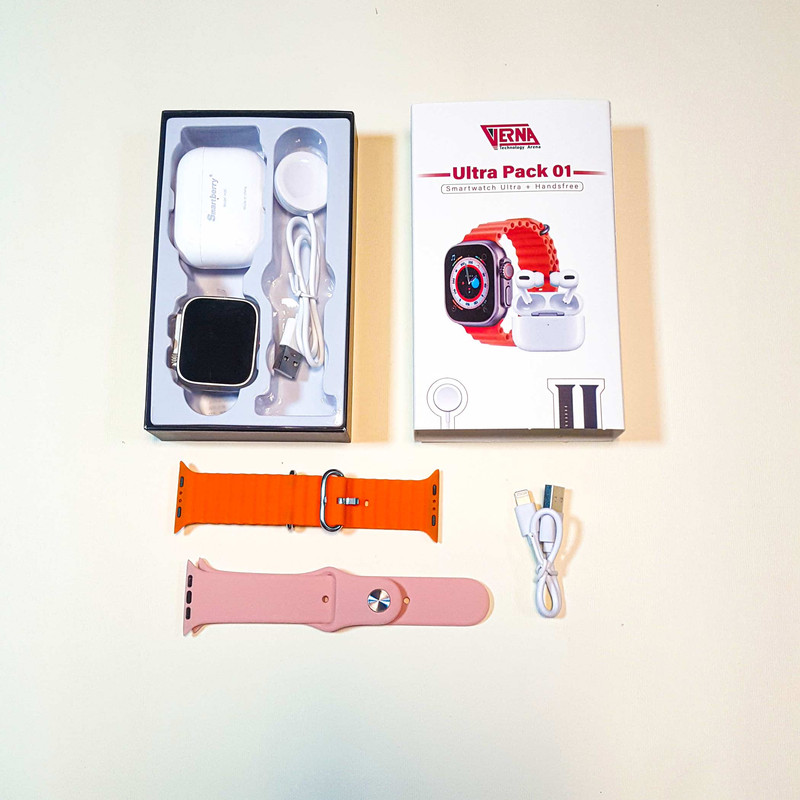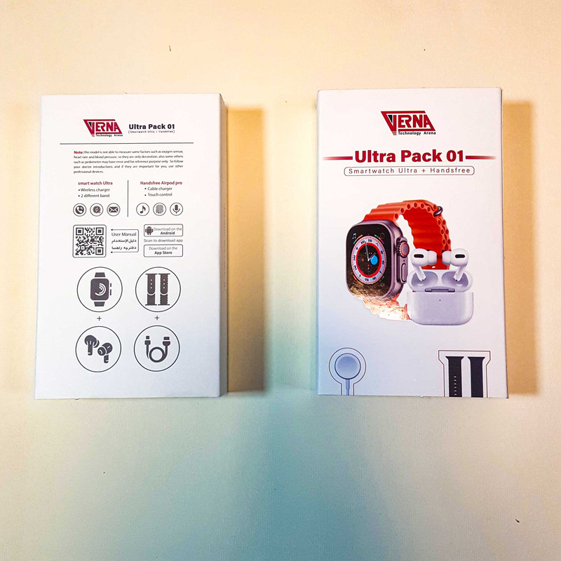 ساعت هوشمند ورنا مدل Ultra pack 01 به همراه هندزفری بیسیم دارای قابلیت های قابلیت مکالمه از طریق بلوتوث، کنترل موسیقی (Music Player)، پشتیبانی از زبان فارسی در منو و سیستمعامل بند سیلیکون