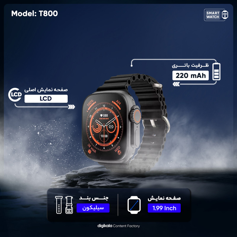 T800یکی دیگر از کلون های جدید اپل واچ اولترا 2022 است که با قیمت بسیار ارزان در بازار موجود است. این یک ساعت هوشمند اسپرت است که طراحی مربعی با صفحه نمایش LCD بزرگ 1.99 اینچی دارد و به چندین ویژگی از جمله نمایشگر ضربان قلب، مانیتور اکسیژن خون SPO2، حالت های Multisport، ضد آب IP67 و پشتیبانی از تماس بلوتوث مجهز است این ساعت هوشمند مربع شکل و به ابعاد 4/5x38/5x1/4 است وزن آن 50 گرم و در رنگ های متنوع مشکی زرد نارنجی و نقره ای موجود میباشد نمایشگر lcd واندازه صفحه نمایش 1.99 اینچ و وضوح صفحه نمایش 250x285 پیکسل است وبا سیستم عامل Android و IOS سازگار است
