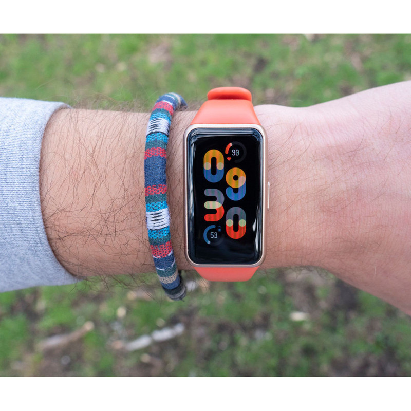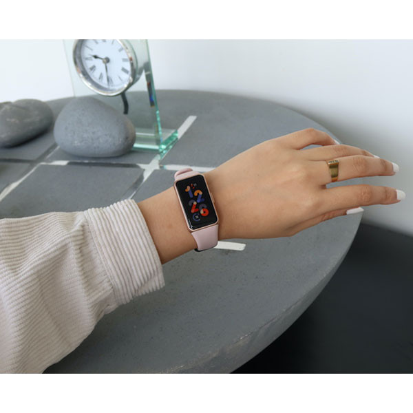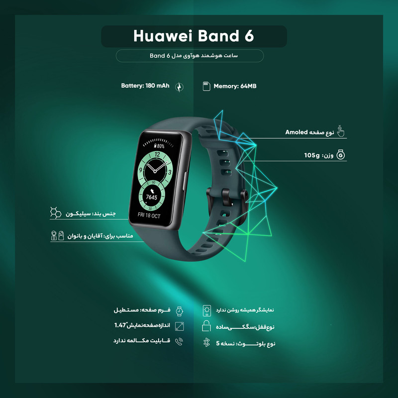 HUAWEI Band 6 صفحه نمایشی 1.47 اینچی از نوع AMOLED دارد که تصویری کامل را ارائه میکند. این صفحه نمایش 1483 درصد بزرگتر از نسخه قبلی بوده و با حاشیه بسیار باریک خود نسبت صفحه نمایش به بدنه 64 درصدی را به وجود آورده است. همه این قابلیتها در کنار رزولوشن تصویری 368 در 194 پیکسلی و مقدار پیکسل در اینچ 282 PPI، صفحه نمایشی با کیفیت را برای این محصول مهیا کردهاند.