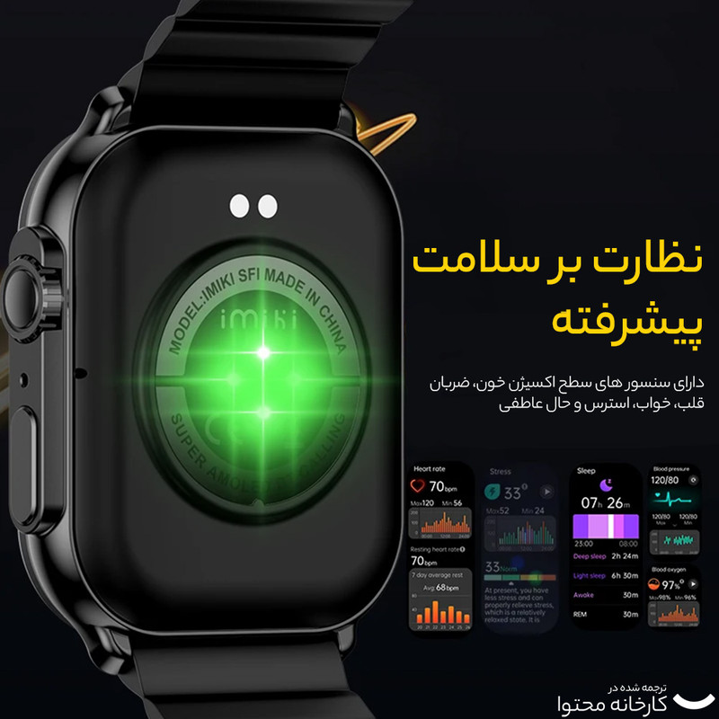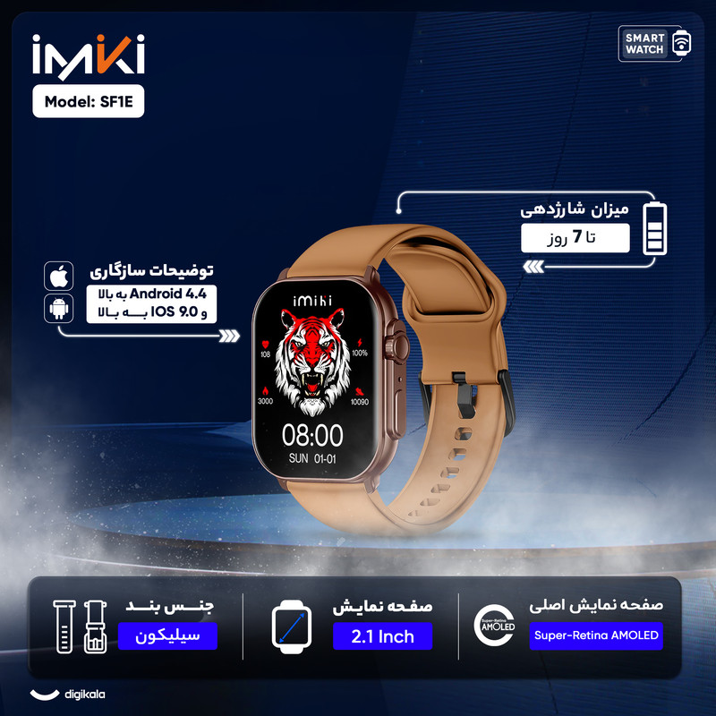 ساعت هوشمند ایمیکی مدل SF1E دارای قابلیت های صفحه نمایش رنگی، صفحه نمایش لمسی، قابلیت مکالمه از طریق بلوتوث بند سیلیکون