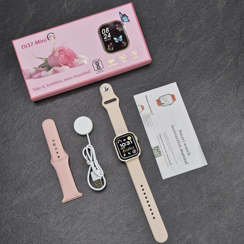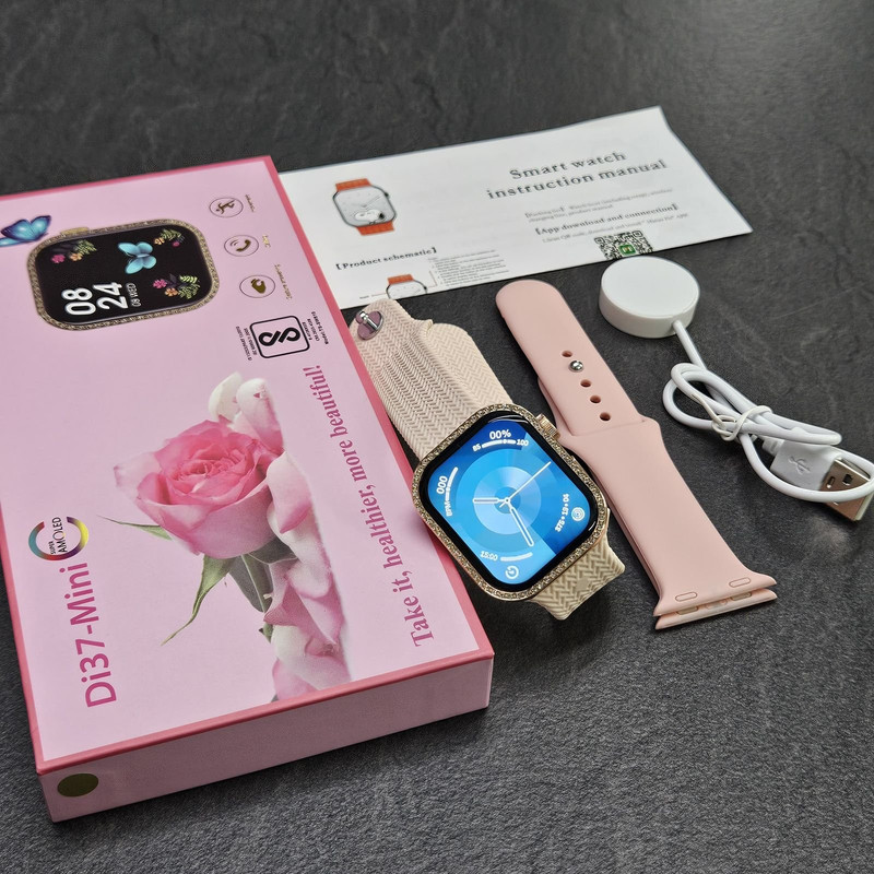 این ساعت هوشمند مچی دارای طراحی زیبا مناسب خانم ها میباشد که دور صفحه نمایش با نگین تزیین شده است ، سایز ساعت 41 میلیمتر است که مناسب دستان ظریف طراحی شده است ، بدنه ساعت فلزی و مقاوم در برابر رطوبت است ، همچنین دارای دو عدد بند سیسکونی قابل شستشو میباشد ،جهت شارژ این ساعت نیاز به رابط شارژ بی سیم است که به همراه واچ تقدیم مشتری گرامی میشود ، وضوح تصویر بسیار بالا بوده و قابلیت مکالمه و نمایش پیام با ماندگاری شارژ بالا نیز باعث شده این ساعت در رده ساعت های خوب قرار گیرد ، قابلیت های مختلف مانند برنامه های سلامت و ورزشی ، ماشین حساب ، هشدار خواب ، بازی ، دفترتلفن و... از دیگر امکانات این ساعت میباشد