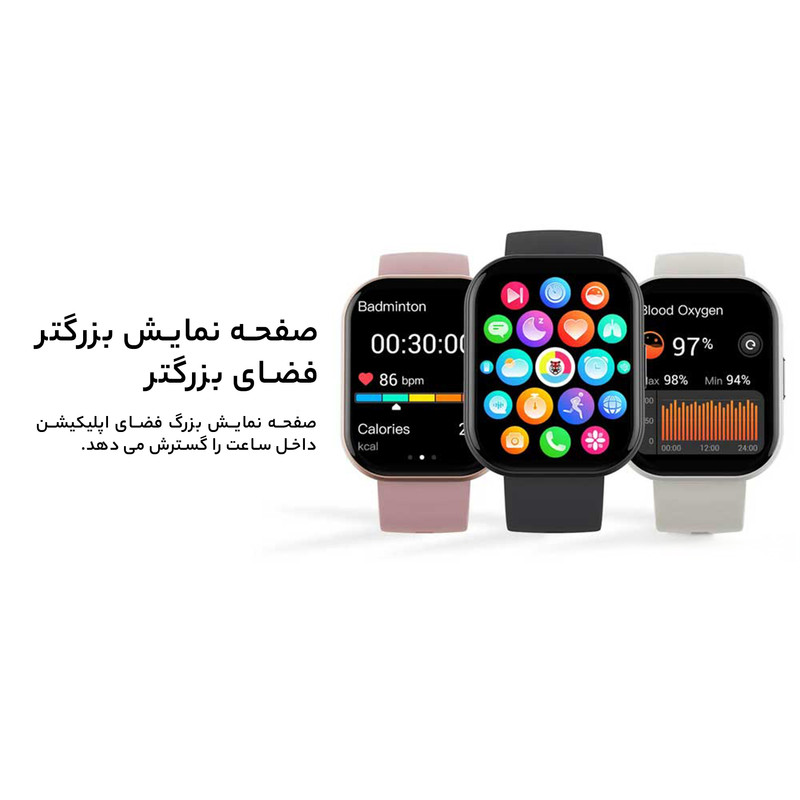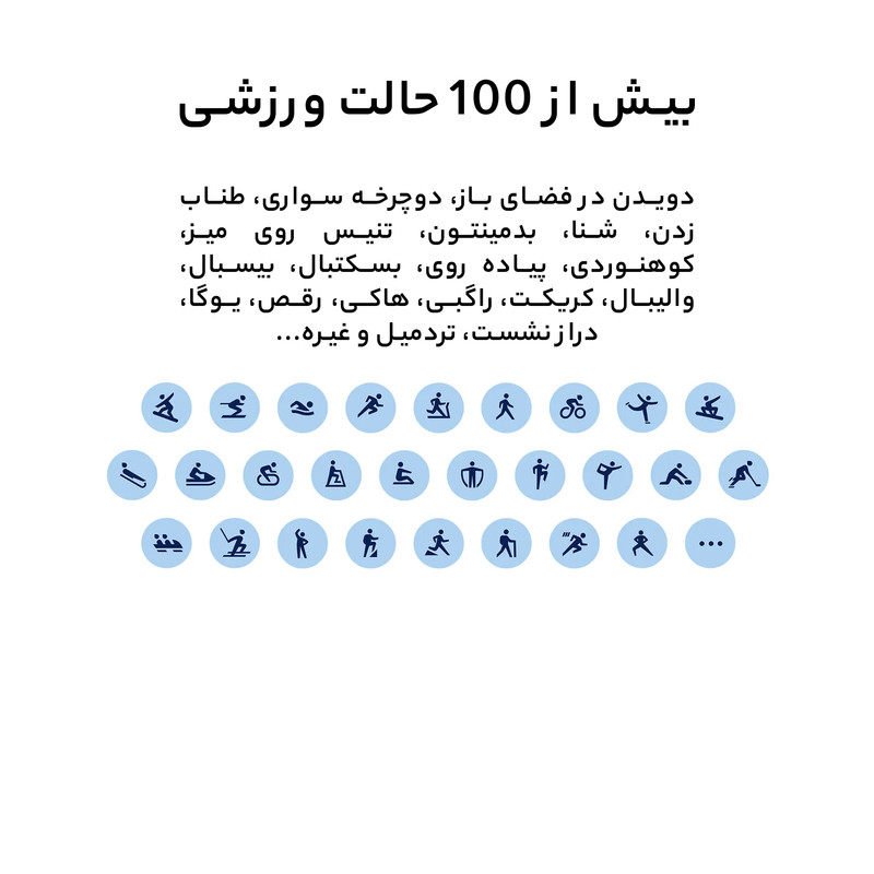 شارژدهی در حالت عادی: تا 5 روز / شارژدهی حداکثری: تا 15 روز / زمان مورد نیاز برای شارژ شدن: حدود 2 ساعت / / بیش از 100 حالت ورزشی / مقاومت در برابر نفوذ آب IP67 / دسترسی به بیش از 100 واچفیس / سنسور فشارسنج خون و کنترل کیفیت خواب
