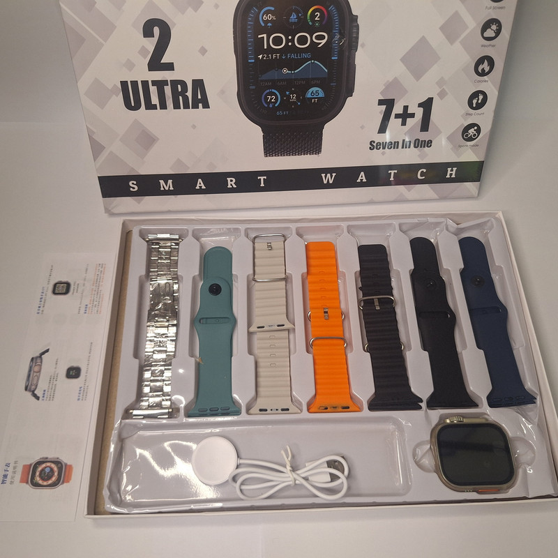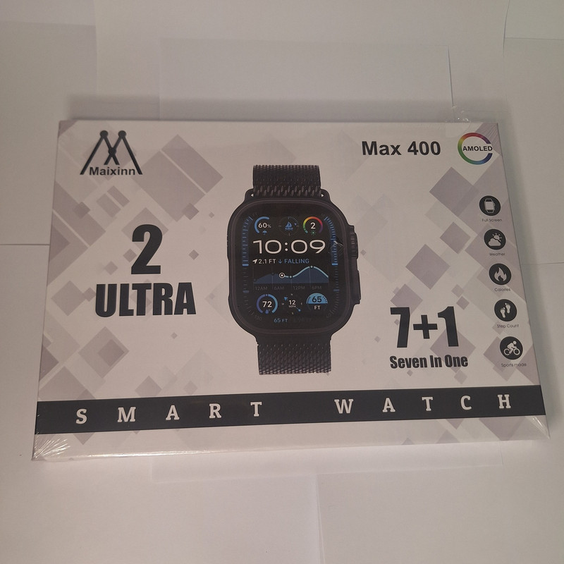 ساعت هوشمند(اسمارت واچ) ULTRA2 مدلmax400 سایز ۴۹ میلیمتر دارای شارژر وایرلس همچنین 7 عدد انواع بند سیلیکونی و استیل است و از صفحه نمایش AMOLED بهره میبرد. حالت های مختلف ورزشی, ژیروسکوپ, سنجش اکسیژن خون, شمارشگر ضربان قلب, کرنومتر, گام شمارش روی این ساعت تعبیه شده است.