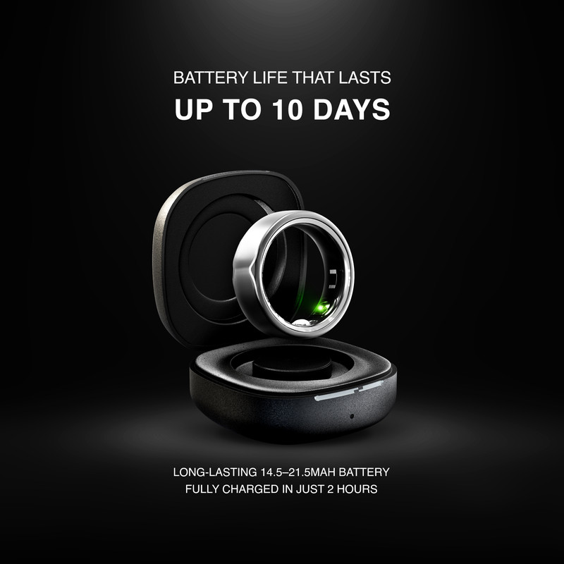 باتری لیتیوم پلیمری این حلقه در دو ظرفیت 14.5 و 21.5 میلیآمپر ساعت (بسته به مقدار مصرف کاربر از حلقه هوشمند) طراحیشده و با یکبار شارژ کامل که حدود 2 ساعت زمان میبرد تا 10 روز دوام دارد. این مدل از بلوتوث نسخه 5.0 پشتیبانی میکند که اتصال پایداری با گوشیهای اندروید و iOS ایجاد کرده و اطلاعات را در نرمافزار اختصاصی ذخیره و تحلیل میکند. حافظه داخلی این حلقه برای ذخیره اطلاعات تا 15 روز مناسب است که باعث میشود اگر ارتباط انگشتر با برنامه مربوطه قطع شود این اطلاعات حفظ بمانند و در دیتابیس به صورت دائم ذخیره شوند.