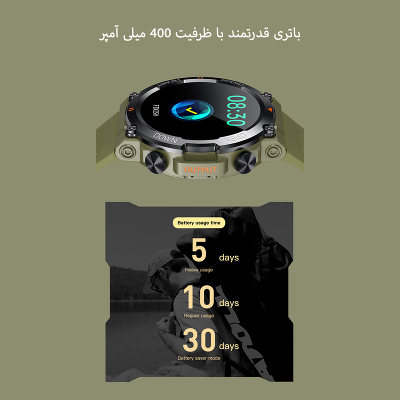 - ورژن بلوتوث : 5.0 - مدت زمان شارژ دهی: در حالت Standby حدود 30 روز - در حالت استفاده 5 تا 10 روز
