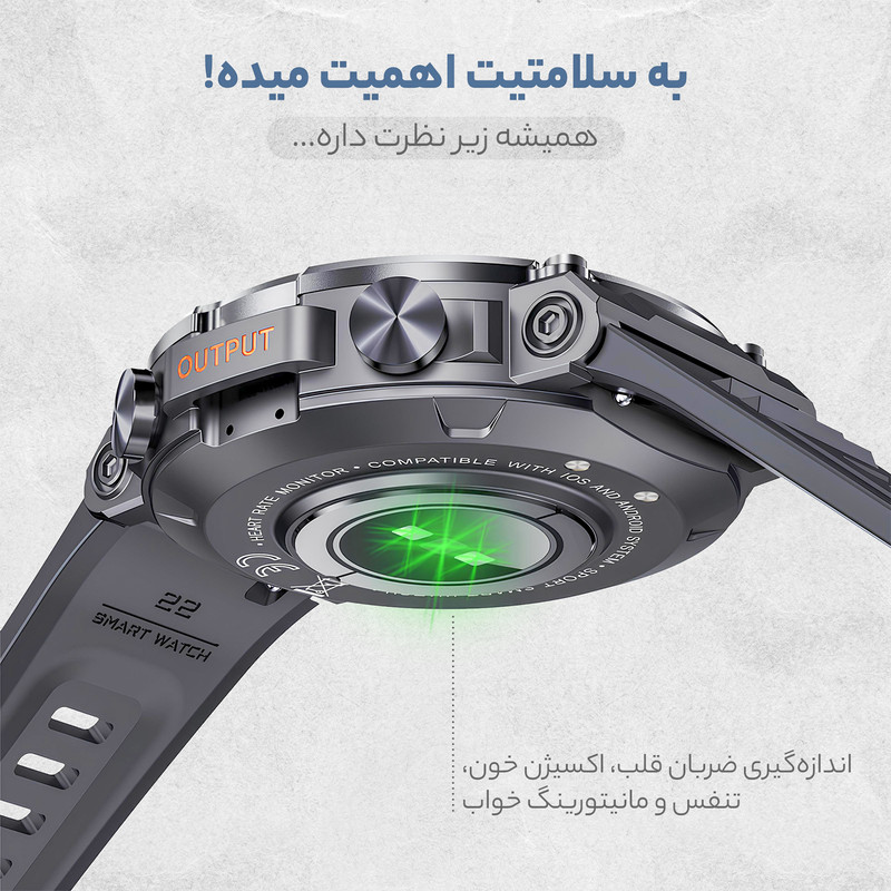 قابلیتهای ساعت هوشمند : صفحه نمایش رنگی , صفحه نمایش لمسی , کنترل موسیقی (Music Player) , قابلیت مکالمه از طریق بلوتوث , پشتیبانی از زبان فارسی در منو و سیستمعامل , قابلیت تغییر طرح ساعت یا تم , ضد آب