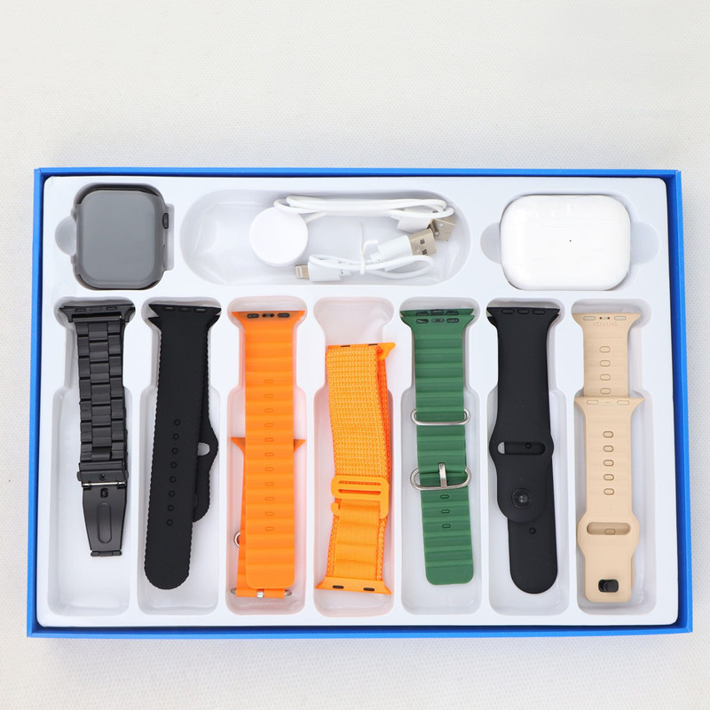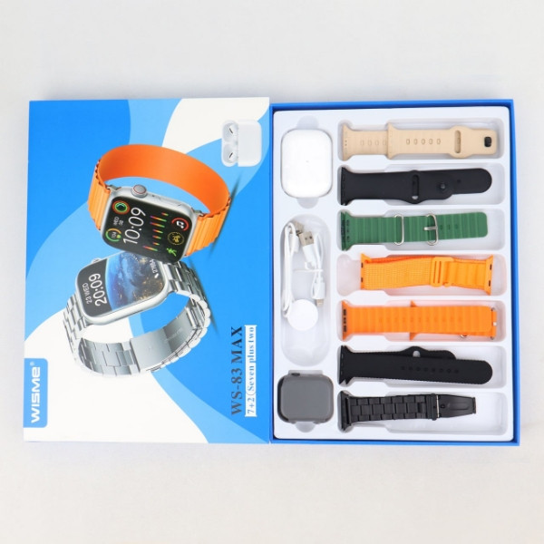 ساعت هوشمند طرح اپل واچ مدل ws-83 max دارای هفت بند با تنوع با رنگ های مختلف و جذاب است که یکی از بندهای آن فلزی طرح رولکسی میباشد.این ساعت یک ایرپاد هدیه نیز به همراه خود دارد.ساعت WS-83 MAX با سایز ۴۵ میلیمتر، دارای صفحه منوی سریع و روان لمسی با قابلیت نمایش اعلان ها و نوتیفیکیشن ها است.برخی از قابلیت های این ساعت به شرح زیر است: دارای شارژر وایرلس پرسرعت، قابلیت مکالمه و برقراری تماس ها،بند قفل دار، دارای شاتر دوربین گوشی،سازگار با بلوتوث ۵ ،سنسورهای ضربان قلب، فشار خون،اکسیژن خون و پایش خواب، گام شمار، کالری شمار، استاندارد ip68( مقاوم در برابر پاشش آب)، پشتیبانی از تغییر واچ فیس ها،قابلیت کنترل موسیقی، ماشین حساب، تقویم،یادآورها، نمایش وضعیت آب و هوا،باتری با طول عمر بالا. داشتن هفت بند با رنگهای متنوع و زیبا در کنار این قابلیت ها ،این ساعت را به عنوان یک ساعت هوشمند جذاب و کاربردی در میان ساعت های هوشمند میان رده قرارداده است.