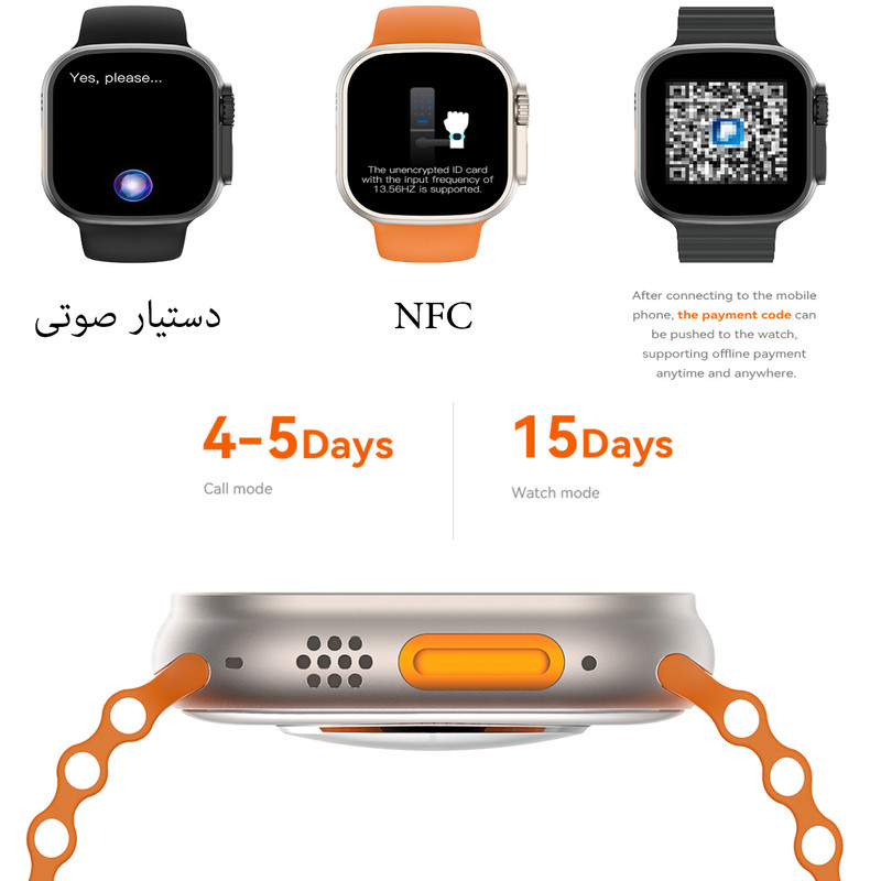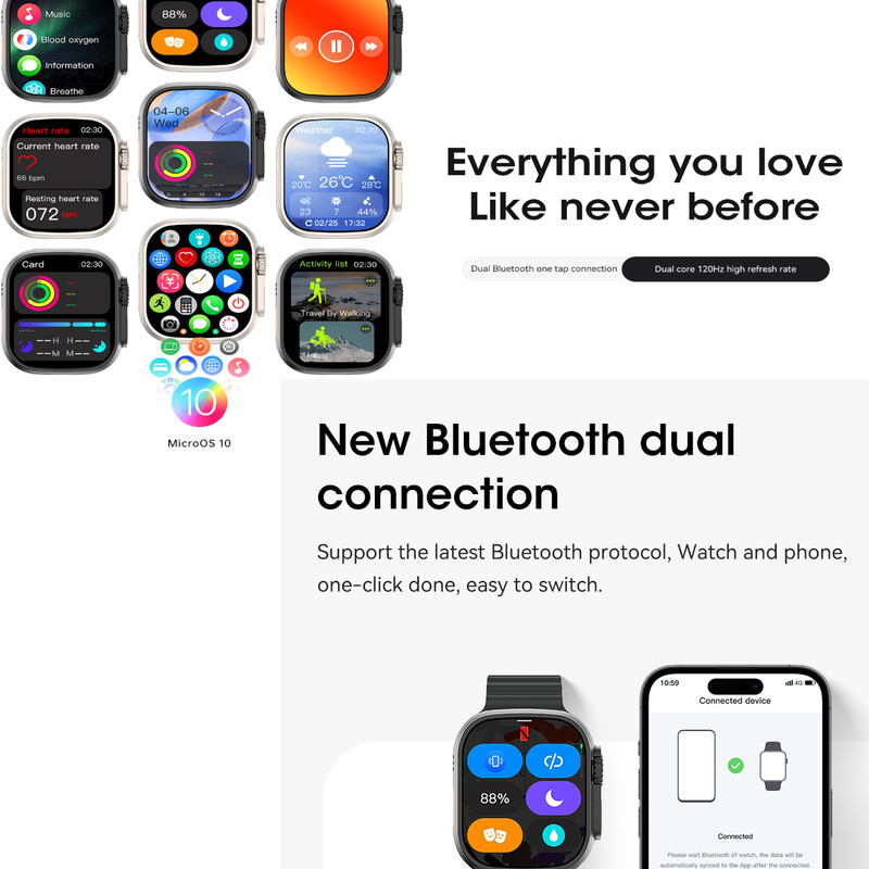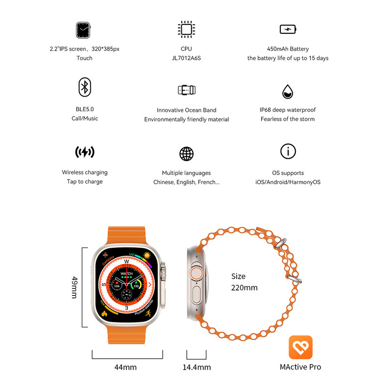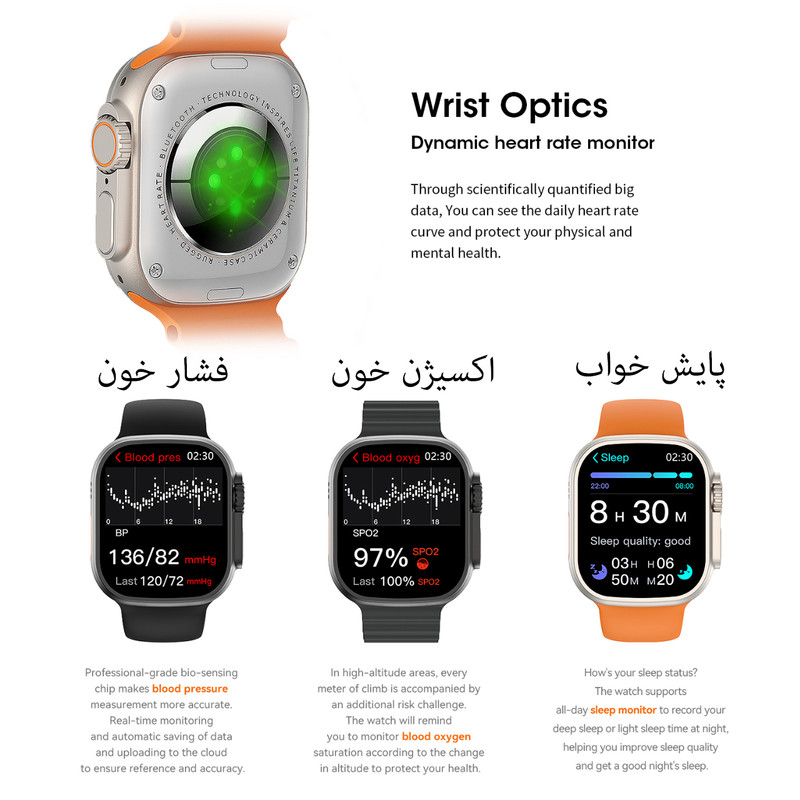 اصالت، کیفیت و دوام بالا در کنار طراحی زیبا و امکانات متنوع اصلی ترین ویژگی برند میکروویر میباشد. ساعت هوشمند میکروویر Microwear Ultra9 Plus با نام بلوتوث Watch Ultra یکی از مدلهای این برند صاحب نام و اصیل است که در تمامی سایت های جهانی فروش موفقی دارد. این مدل هم اکنون در سایت دیجیکالا در دسترس است. نرم افزار مخصوص اتصال این ساعت M ActivePro است و استاندارد CE اروپا را دارد. سیستم عامل قدرتمند Micro OS10 روی این ساعت نیز نصب است و از باتری بسیار قدرتمندی جهت نگهداری شارژ بهره میبرد. امکانات نرم افزاری و گرافیکی زیبا مانند منو آبشاری، اسلاید صفحه به چپ یا راست، زوم اسکرول، قطب نما،ارتفاع از سطح آبهای آزاد، پخش موزیک و قابلیت اتصال به هدفون بلوتوثی، چت GPT، شاتر دوربین، نمایش آب و هوا، ماشین حساب، چراغ قوه، تقویم، اپ استور مخصوص جهت دانلود برنامه از نرم افزار، آلبوم عکس، منو پیرفته، بازی، GPS Movement، تماس بلوتوثی، متابولیسم، ماساژ ویبره، واچ فیس فراوان، صفحه نمایش همیشه روشن، Beside lamp، فرمان های حرکتی فعال، اندازه گیری دمای بدن، حالت بهینه مصرف باتری، نوار قلب ECG، رینگ تون مستقل، دستیار صوتی، برنامه بانوان، مدهای ورزشی کامل، گجت های کاربردی فراوان، اندازه گیری های سلامتی کامل و... تنها بخشی از امکانات این ساعت لوکس به شمار می آید. برای دیدن کامل امکانات حتمل بخش مشخصات را بخوانبد و بیشتر با امکانات این ساعت فوق العاده آشنا شوید.