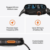 اگر به دنبال ماجراجویی هستید و ساعت هوشمند همهچیز تمامی میخواهید که از هر نظر عملکرد بسیار خوبی داشته باشد، بدون شک ساعت هوشمند اپل مدل Ultra 2 Black titanium 49mm میتواند یکی از بهترین انتخابهای ممکن برای شما باشد. به نسبت ساعتهای هوشمند سری 9، این ساعت از مشخصات فنی مناسب و بسیار قدرتمندتری بهره برده است. در نمای روبهرویی شاهد حضور صفحهنمایش بزرگ با ابعاد 1.92 اینچ و رزولوشن 410×502 پیکسل هستیم که توانایی نمایش فوقالعاده 338 پیکسل در هر اینچ را دارد. تا همینجا میدانیم که با یکی از قدرتمندترین صفحاتنمایش در بین ساعتهای هوشمند جهان روبهرو هستیم اما شگفتزده میشوید وقتی که بدانید این صفحهنمایش توانایی ارائه حداکثر روشنایی 3000 نیت (nits) را هم دارد. میزان روشنایی که سبب شده تا نهتنها در شرایط نوری متنوع، بلکه برای مثال زیر تابش مستقیم نور خورشید هم وضوح تصویر بینظیری را از آن شاهد باشید. متریال تیتانیموم برای فریم و تکنولوژی ساخت پیشرفته سبب شده تا این ساعت از استاندارد IP6X پشتیبانی کند و در نهایت توانایی مقاومت در عمق 100 متری آب را هم دارد. پس در شرایط جوی متنوع و ورزشهای آبی بدون هیچ نگرانی از این ساعت هوشمند استفاده کنید و لذت ببرید. حضور برنامههای ورزشی متنوع و برنامههای سلامت متنوع که از مهمترین آنها میتوانیم به سنجش اکسیژن خون، کنترل ضربان قلب و سنجش دمای بدن اشاره کنیم سبب شدهاند تا این ساعت هوشمند بیش از خودتان به فکر سلامتیتان باشد. باتری قدرتمند با میزان ظرفیت 542 میلیآمپرساعت هم از دیگر مشخصات در نظر گرفته شده برای این ساعت هوشمند قدرتمند و پرچمدار است. گفتیست که این ساعت با آیفون XS (و بعد از آن) سازگار است؛ البته برای استفاده از تمامی امکانات ساعت، iOS 18 نیاز است.