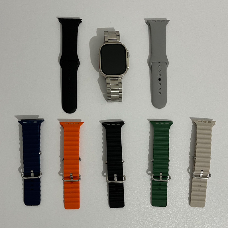 یک عدد بند رولکس استیل دو عدد بند سلیکونی طوسی مشکی چهارعدد بند سلیکون پافر نارنجی مشکی طوسی روشن سبز