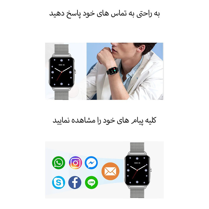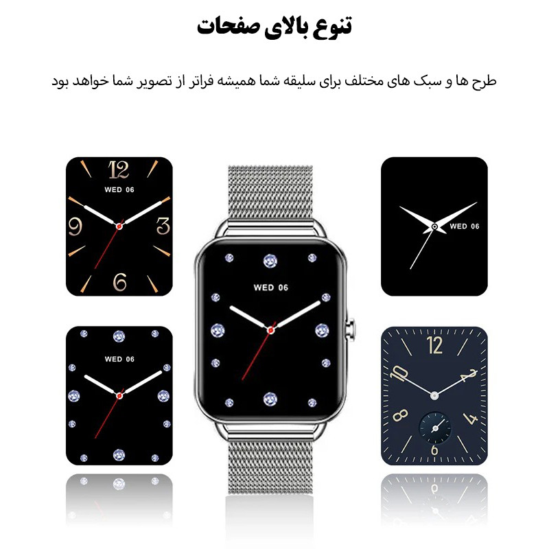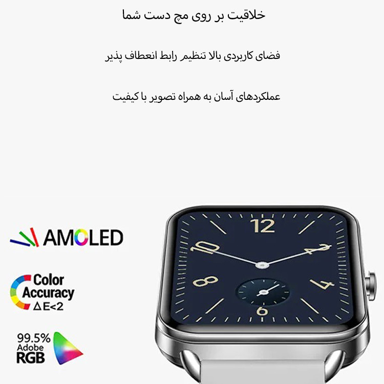 صفحه نمایش رنگی , صفحه نمایش لمسی , کنترل موسیقی (Music Player) , قابلیت مکالمه از طریق بلوتوث , قابلیت تغییر طرح ساعت یا تم