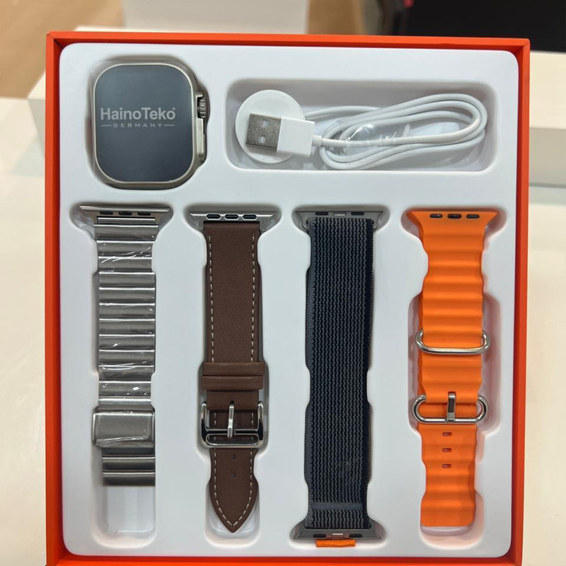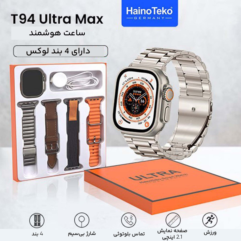 ساعت هوشمند Haino Tecko T94 Ultra Max سری 8 محصول شرکت هاینوتکو آلمان ضمانت اصالت این برند، یک برند آلمانی بوده که محصولات اقتصادی و باکیفیت خود را در چین مونتاژ میکند. تمرکزش را روی طراحی و تولید لوازم جانبی و تجهیزات الکترونیکی معطوف کرده و ساعت هوشمند هاینو تکو مدل T94 Ultra Max، یک نمونه از تولیدات پرفروشش میباشد. اگر به دنبال یک ساعت هوشمند مقرون به صرفه هستید که از قابلیت مکالمه تلفنی برخوردار باشد، کمتر ساعت هوشمندی با رده قیمتی Haino Teko T94 Ultra Max پیدا میکنید. دارای بند سرامیکی و فوق العاده زیبا مجهز به حسگرهای ضربان قلب ، کالری سنج ، اندازه گیری اکسیژن خون ، گام شمار ، اندازه گیری فشار خون ، کیفیت خواب و … قابلیت مکالمه دارای تاییده ضد اب IP68 نسخه بلوتوث 5.0 باتری 220 میلی آمپر ساعتی گر به دنبال یک ساعت و یک ایرپاد اقتصادی هستید، ساعت هوشمند Haino Tecko T94 Ultra Max سری 8 یک ساعت فول امکانات سری 8 را به شما معرفی میکنیم. کیفیت این ساعت ++A است و قابلیت های فراوانی نظیر فارسی سازی منو و خواندن پیام های فارسی را دارد که برای کاربران ایرانی اهمیت ویژه دارد. 3 تم متنوع و جدید منو، تبدیل صفحه نمایش به چراغ قوه، دستیار صوتی، تقویم، ماشین حساب، کرنومتر، تمرین تنفس و ریلکسیشن، آلارم مجهز به ویبره و زنگ، تنظیم خودکار زمان پس از اتصال، منو ساید بار، تنظیم روشنایی، پسورد گذاری روی ساعت، آب و هوا، پخش موسیقی و مکالمه ،کنترل شاتر دوربین، فشار خون، اکسیژن خون، ضربان قلب، پایش خواب، آلارم نشستن طولانی مدت، قدم شمار، مدهای ورزشی، لیست تماس ها، دفترچه تلفن و ... فقط برخی از امکانات این ساعت است. این ساعت علاوه بر اینکه میتواند تمامی نیاز شما را از یک ساعت هوشمد برطرف کند دارای کیفیت بالایی است و قیمت آن نسبت به ساعت های هم رده خود مناسب تر است. این پک هدیه دارای یک ایرپاد با کیفیتو یک بند اضافه الترایی و سک جا سوییچی جام جهانی عرضه میگردد