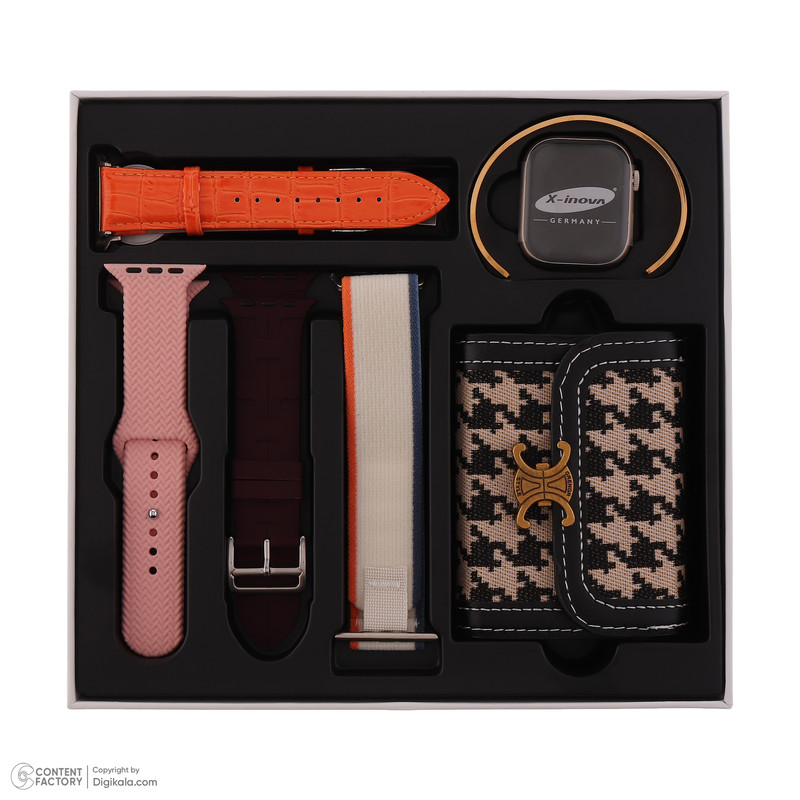 اقلام همراه : کیف کارتی / سه عدد بند ساعت / مچ بند فلزی / کابل شارژر مغناطیسی / برگه راهنما