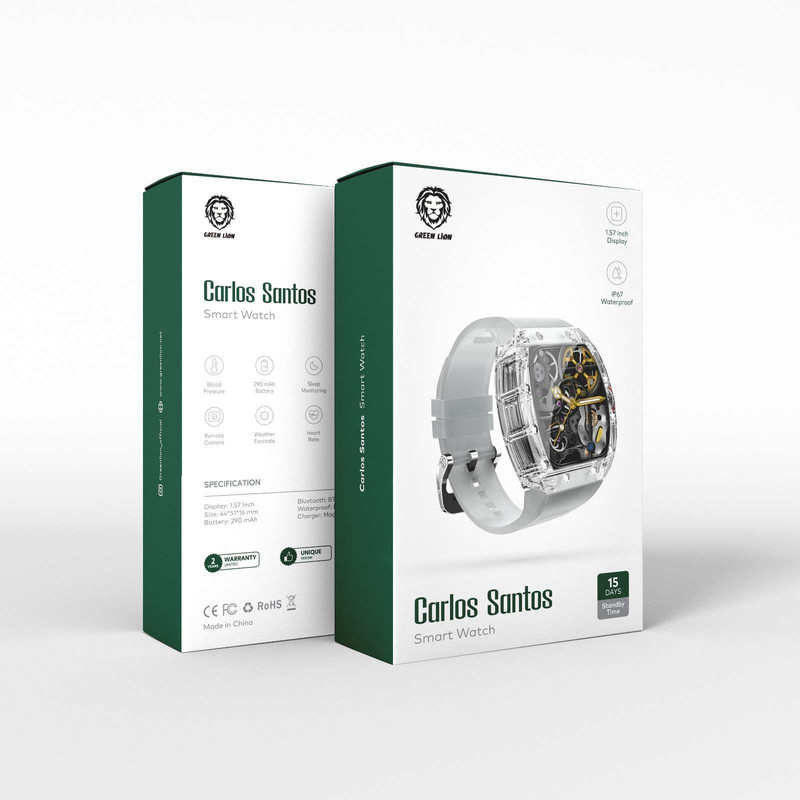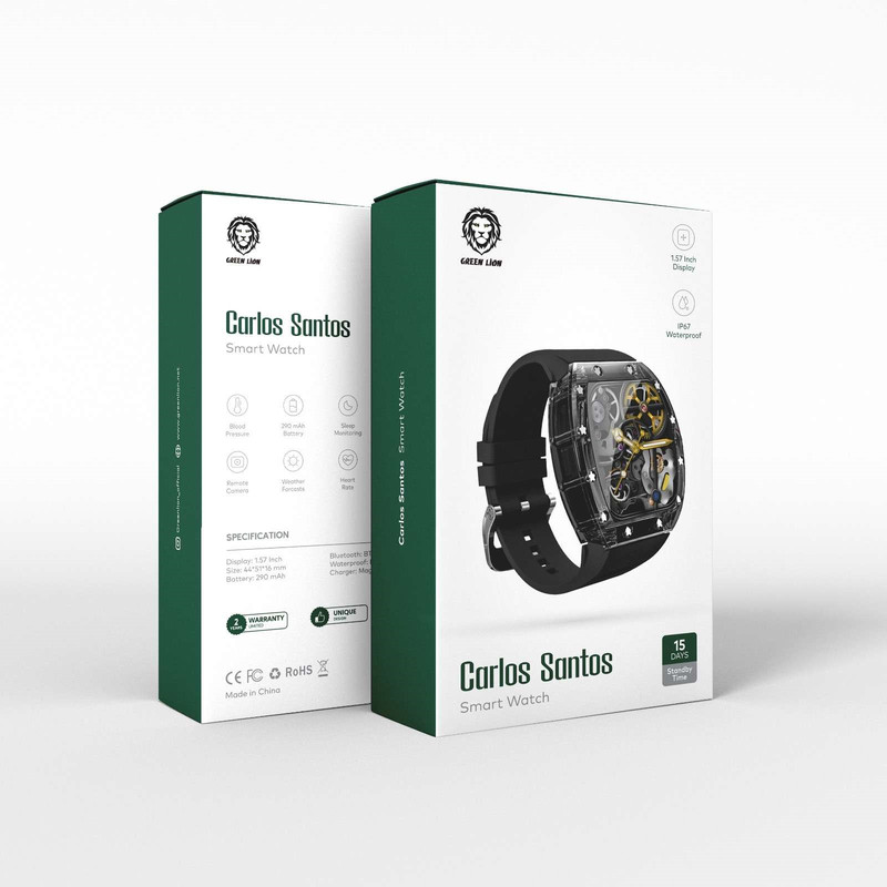 کمپانی گرین لاین خیلی زود توانست جایگاه مناسبی در بازار گجت ها و لوازم جانبی گوشی بدست آورد البته با تکیه بر خلاقیت و کیفیت . از جمله گجت های بسیار معروف و محبوب این برند ساعت های هوشمند گرین می باشد . ساعت جدید کارلوس سانتوس تلفیقی زیبا از ظاهر مکانیکی و کلاسیک در کنار قابلیت های بروز و کارآمد ساعت های هوشمند می باشد صفحه 1.5 اینچی باتری 290 میلی آمپری و استاندارد IP67 ضد آب از قابلیت های سخت افزاری این ساعت می باشد از دیگر ویژگی های آن می توان به قابلیت اندازه گیری فشار خون پایش خواب قابلیت ترک کردن ورزش های مختلف ریموت دوربین ضربان قلب آب و هوا چند گیم و نشان دادن پیامهای گوشی اشاره کرد