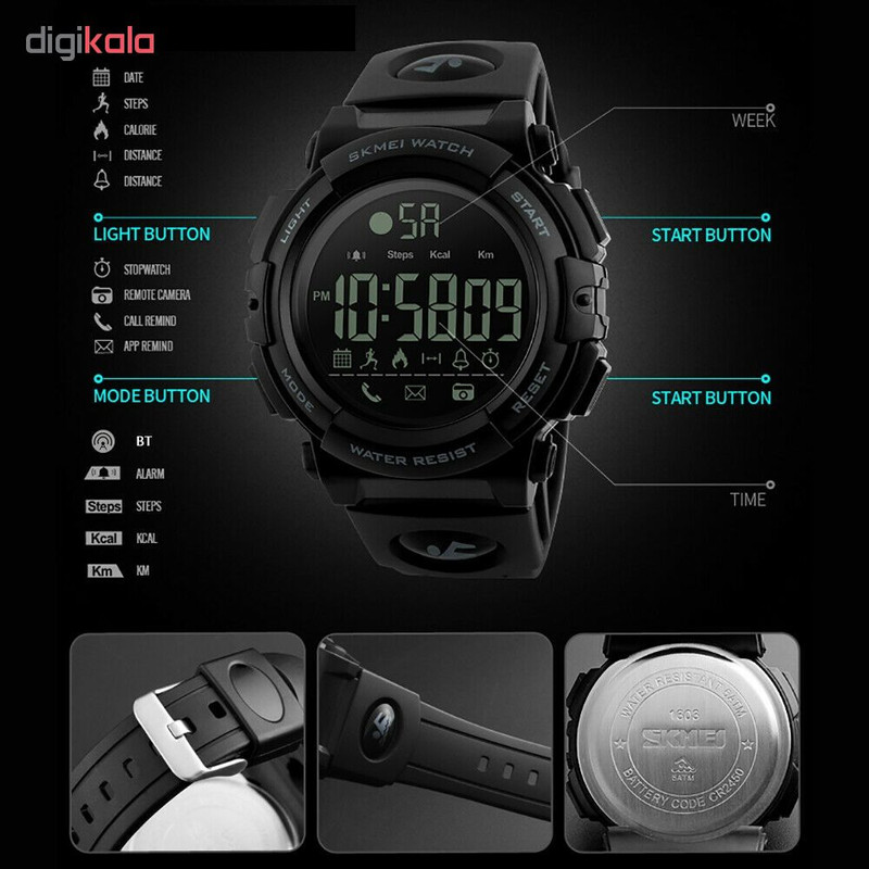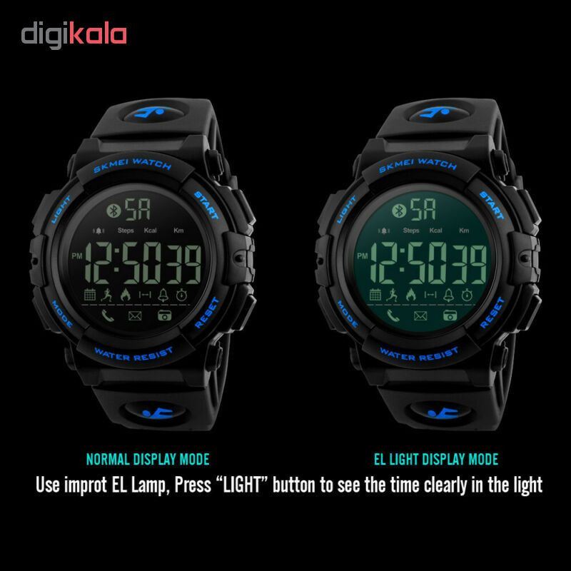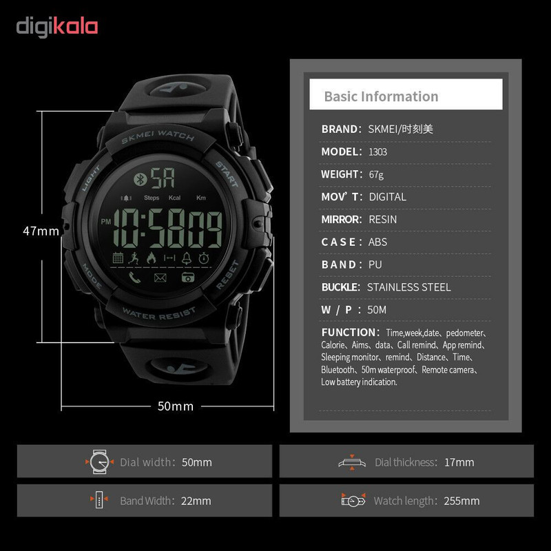 ساعت هوشمند اسکمی مدل « 1303» پساز اتصال از طریق بلوتوث به سیستمعامل Android 4.3 به بالا و ios 7 به بالا شروع به رصد کردن فعالیتهای شما در طول شبانهروز میکند. بهدلیل ضدآب بودن تا عمق 30متر،این ساعت هوشمند گزینهای مناسب برای ورزشهای آبی است و دارای باتری داخلی است که تا مدتها نیازی به تعویض ندارد و بهدلیل طراحی ورزشی دارای نور پسضمینه است که با فشردن دکمهای که در کنار ساعت تعبیه شده فعال میشود. پساز ست شدن گوشی با ساعت، میزان کالری مصرفی بهصورت دورهای و روزانه و لحظه به لحظه از طریق برنامه نصب شده قابل مشاهده است. اعلان شبکههای اجتماعی و تماس ورودی از دیگر قابلیتهای این ساعت است.
