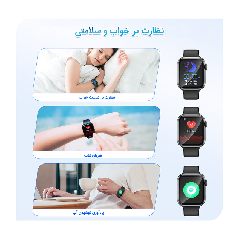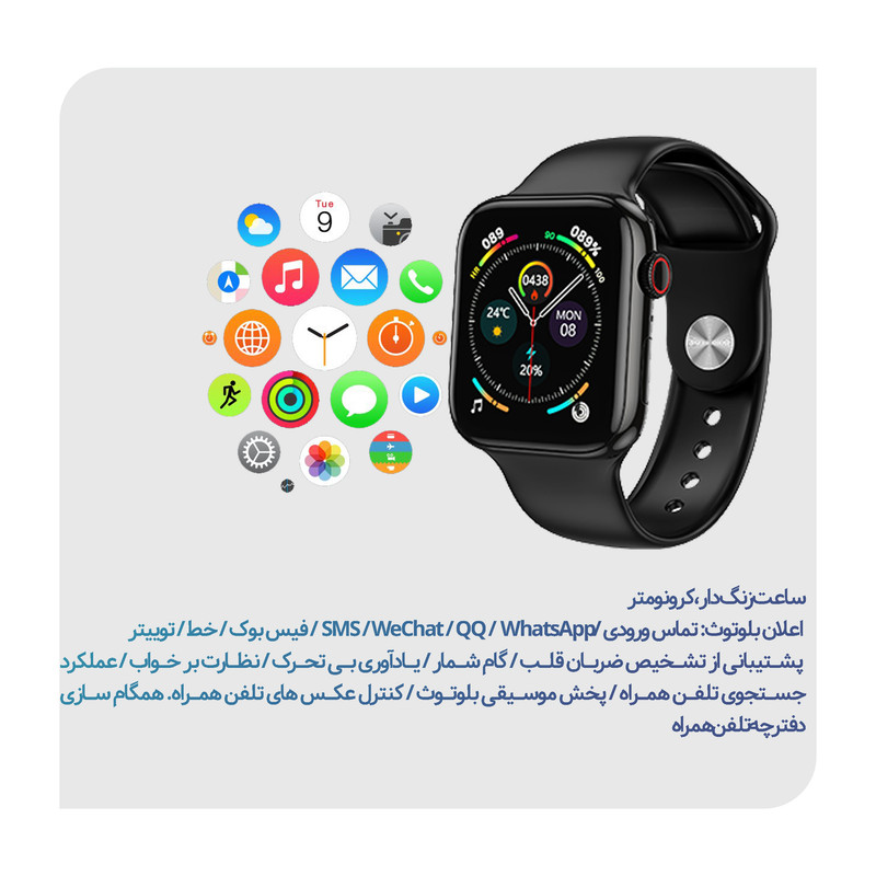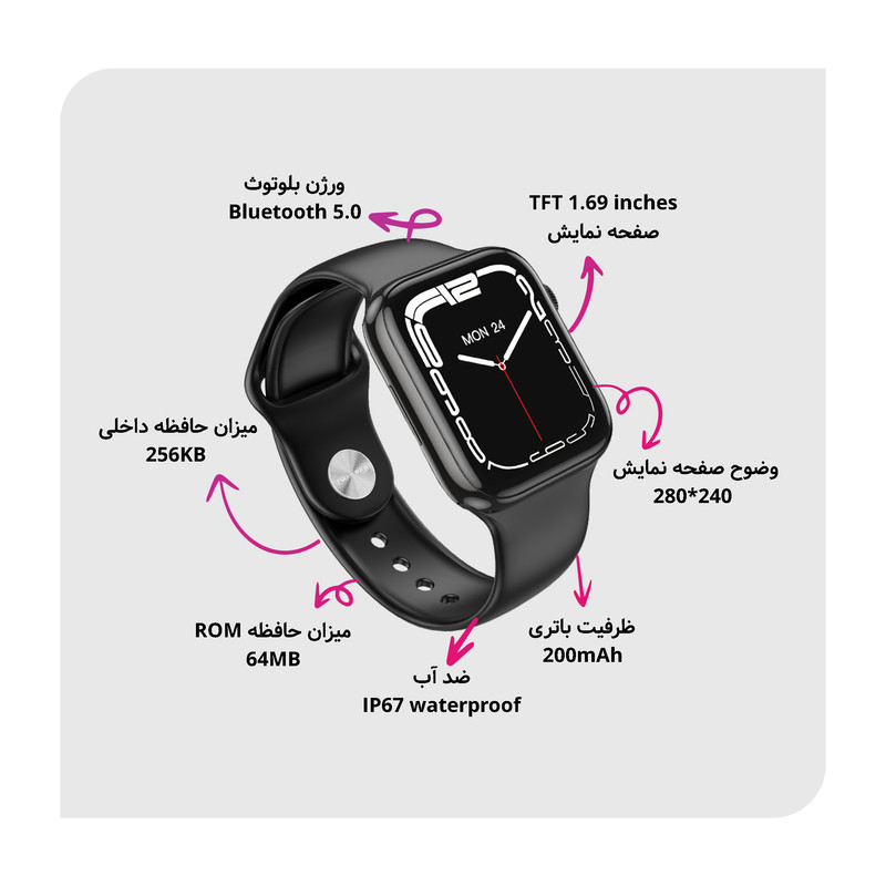 قابلیت‌های ساعت هوشمند : پشتیبانی از زبان فارسی در منو و سیستم‌عامل , صفحه نمایش لمسی , قابلیت مکالمه از طریق بلوتوث , کنترل موسیقی (Music Player)