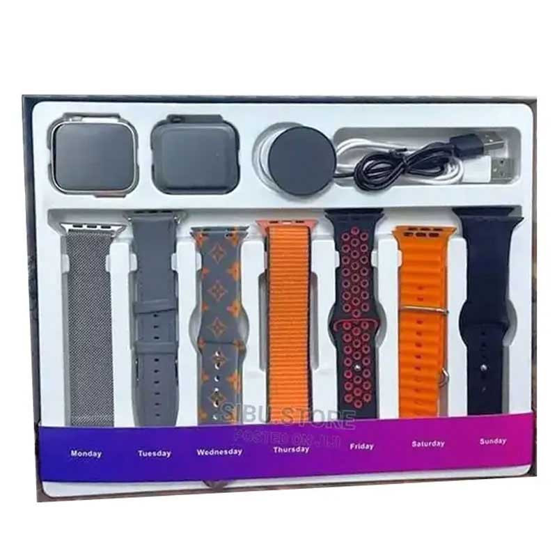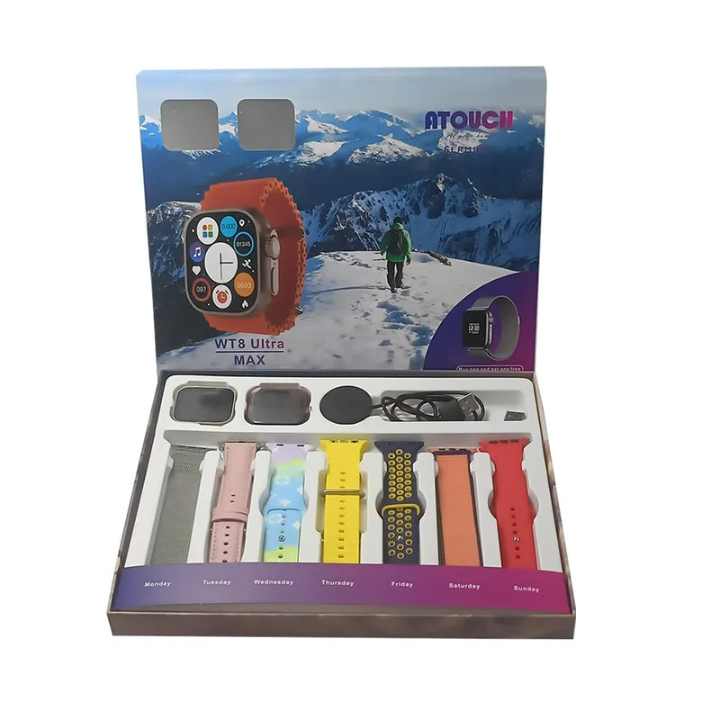ساعت هوشمند مدل WT8 Ultra Max از برند معتبر ATOUCH می باشد در جعبه آن یک عدد ساعت طرح اولترا و یک عدد ساعت طرح سری 8 به همراه 7 بند با کیفیت با رنگ های متنوع و دو شارژر وایرلس می باشد.