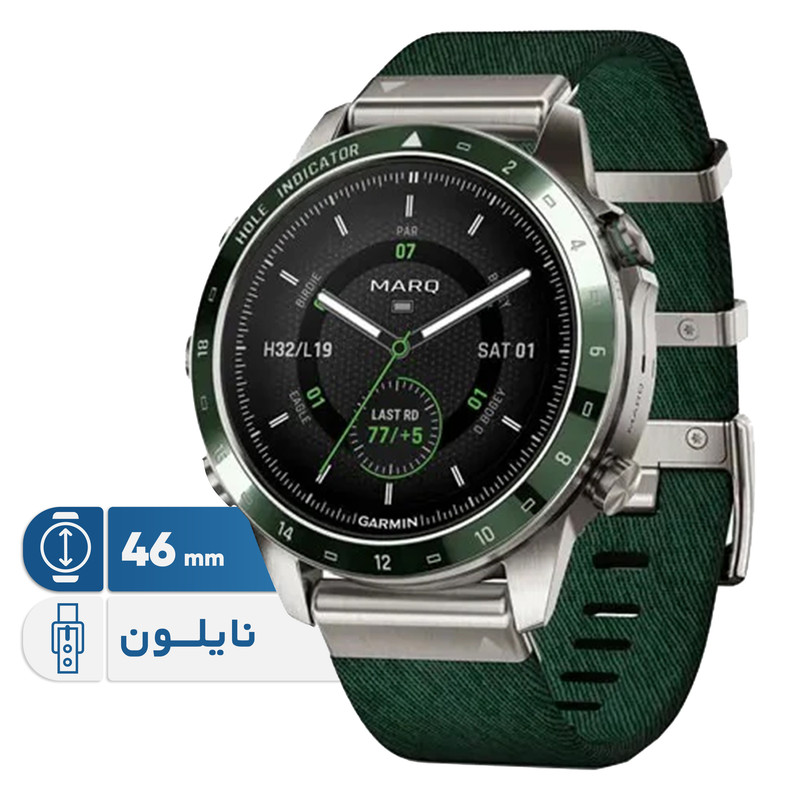 ساعت گارمین مارک اتلت GARMIN MARQ® Golfer (Gen 2) یک ساعت هوشمند ورزشی لوکس است . گارمین مارک گلفر همانطور که از اسمش پیداست مناسب ورزش گلف است وبرای این ورزش آپشن های تخصصی دارد . از این رو درمیان آقایان و خانم ها و ورزشکاران حرفه ای و... طرفداران زیادی دارد . ساعت گارمین مارک گلفر (نسل 2 ) دارای 3 عدد سنسور اپروچ 10 یا Approach® CT10 sensors است که در محاسبه سرعت و قدرت ضربه کارایی دارد . این ساعت دارای یک بند نایلونی سبز رنگ زیبا و بند سیلیکونی سبز سایز 22 میلیمتری ست. صفحه نمایش این ساعت از جنس سافایر ، گنبدی Domed sapphire crystal و از نوع آمولد AMOLED است . بدنه این ساعت تماما از جنس تیتانیوم و بسیار سبک و زیباست .