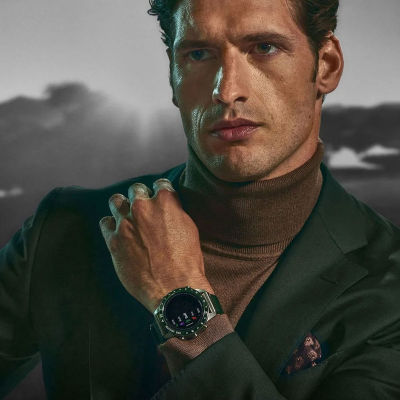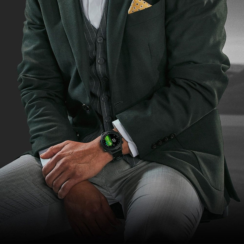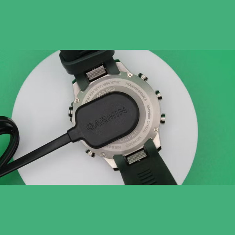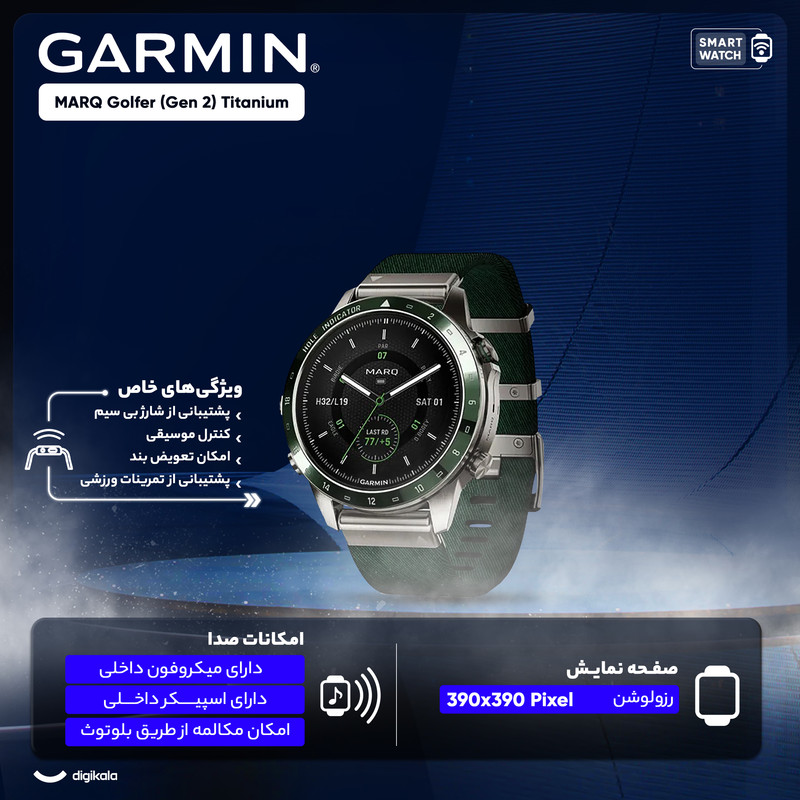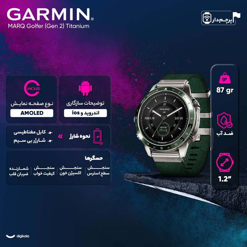 ساعت گارمین مارک اتلت GARMIN MARQ® Golfer (Gen 2) یک ساعت هوشمند ورزشی لوکس است . گارمین مارک گلفر همانطور که از اسمش پیداست مناسب ورزش گلف است وبرای این ورزش آپشن های تخصصی دارد . از این رو درمیان آقایان و خانم ها و ورزشکاران حرفه ای و... طرفداران زیادی دارد . ساعت گارمین مارک گلفر (نسل 2 ) دارای 3 عدد سنسور اپروچ 10 یا Approach® CT10 sensors است که در محاسبه سرعت و قدرت ضربه کارایی دارد . این ساعت دارای یک بند نایلونی سبز رنگ زیبا و بند سیلیکونی سبز سایز 22 میلیمتری ست. صفحه نمایش این ساعت از جنس سافایر ، گنبدی Domed sapphire crystal و از نوع آمولد AMOLED است . بدنه این ساعت تماما از جنس تیتانیوم و بسیار سبک و زیباست .