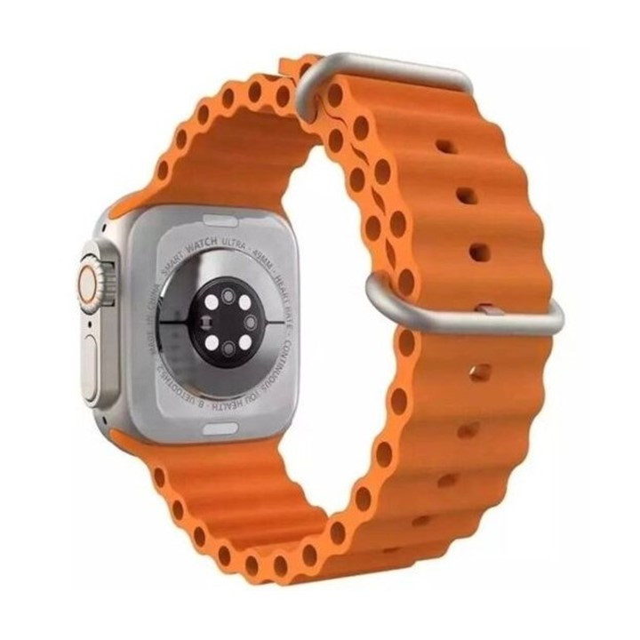 محل اسپیکر و میکروفون و محل اتصال بندها را میبینید، مشابه ساعت اپل اصلی دارای پیچ و پین بند است. پشت ساعت محل اتصال به شارژر وایرلسی و همچنین سنسور سنجش ضربان قلب قرار دارد. این ساعت با ظاهر مقاوم و متفاوت خودش بیشتر مناسب مچ دست های بزرگتر هست که البته این امر کاملا سلیقه ای میباشد.