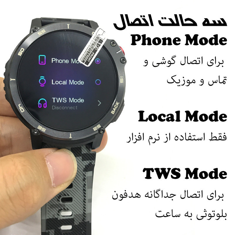 توضیحات رنگ بند و بدنه : این ساعت در یک رنگ مشکی عرضه میشود و رنگ اجزاء آن شامل ساعت مشکی، بند فلزی مشکی و بند سیلیکونی طوسی ارتشی است