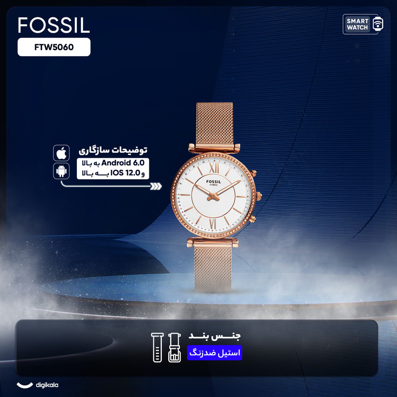 ساعت هوشمند فسیل مدل FTW5060 دارای قابلیت های صفحه نمایش رنگی بند استیل ضدزنگ