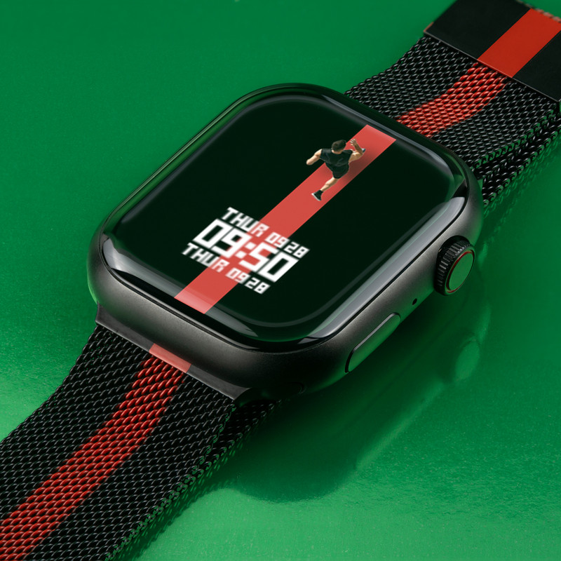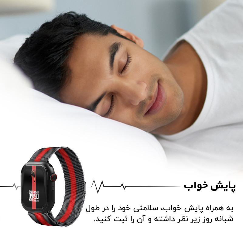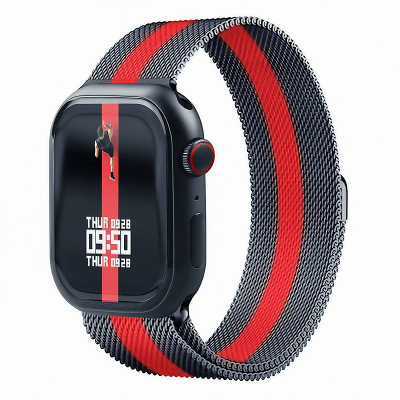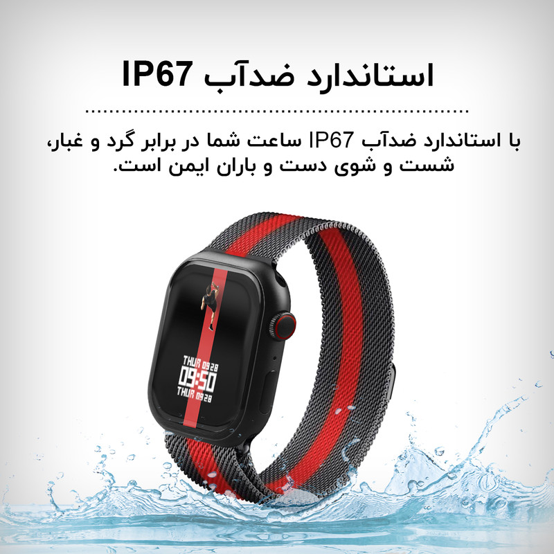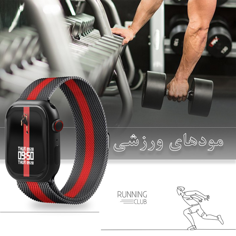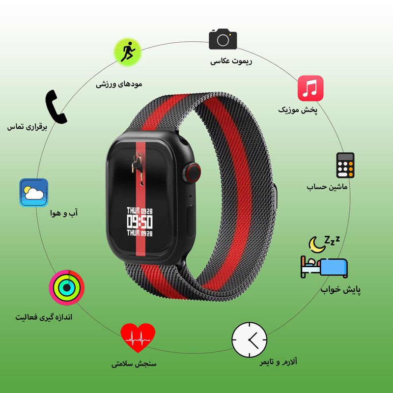 رنگ بدنه مشکی مات و بند حصیری فلزی به انتخاب در 4 رنگ لاین قرمز لاین آبی لاین سفید و لاین سبز آبی میباشد