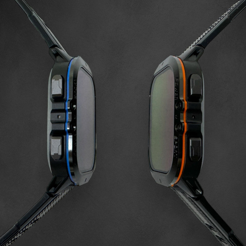 توضیحات رنگ بند و بدنه : رنگ بدنه و بند ساعت مشکی است. رنگ بندی بر اساس نوار باریک وسط بدنه به دو رنگ نارنجی و آبی تقسیم میشود.