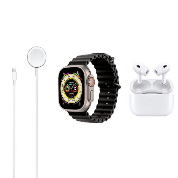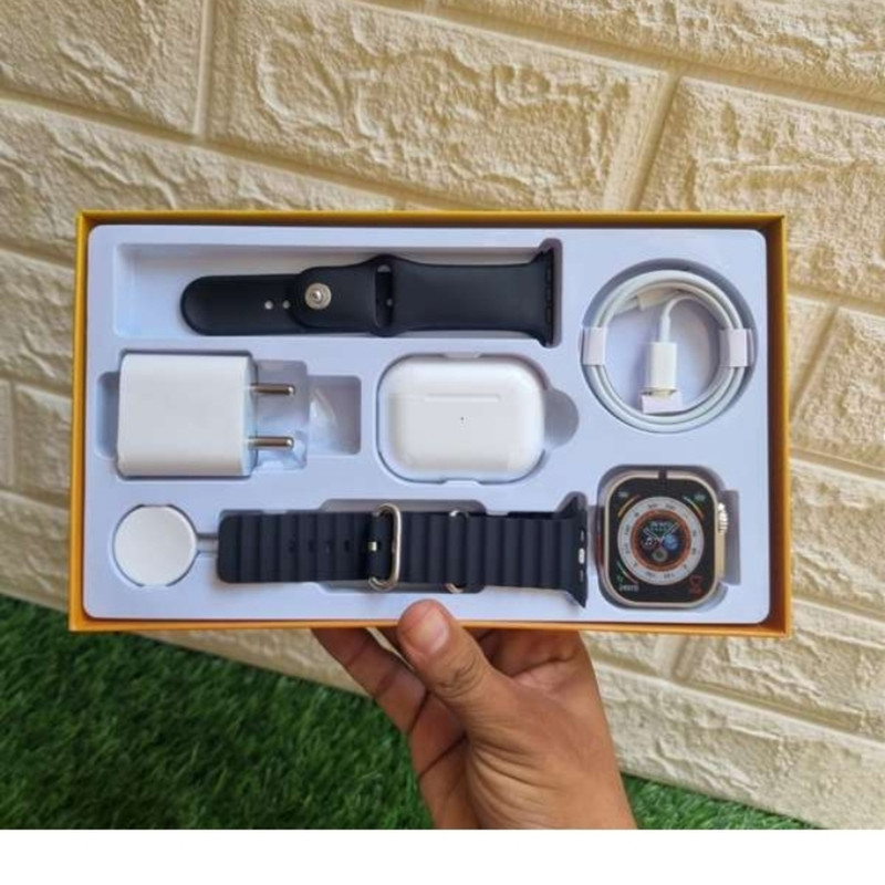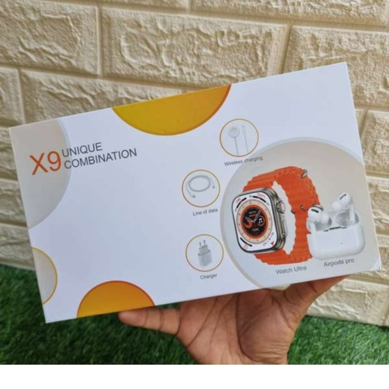 ساعت هوشمند X9 Ultra (نام بلوتوث :Watch 8 Ultra ) Airpods pro کابل شارژ مغناطیسی برای ساعت کابل شارژ ایرپاد دو عدد بند سلیکونی دفترچه راهنما به زبان انگلیسی طراحی شیک و جذاب دقیقا مشابه با اپل واچ دارای انیمیشن های جذاب حین استفاده از ساعت و دارای هوش مصنوعی Chat GPT