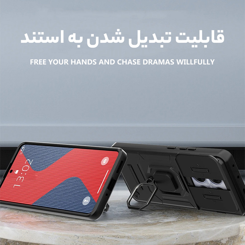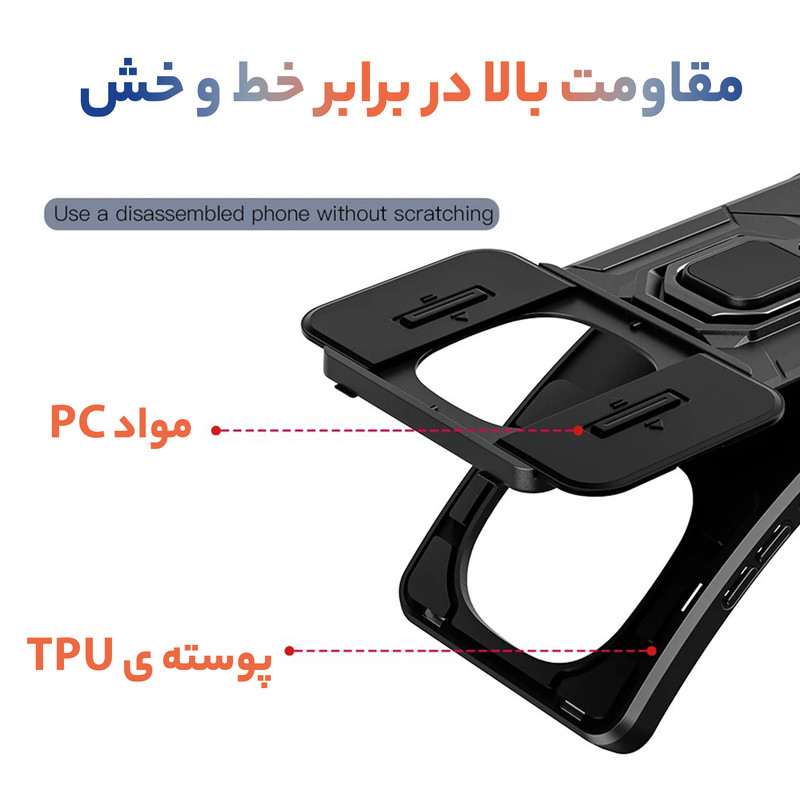 قابلیت تبدیل شدن به استند , لبه های برجسته برای محافظت صفحه نمایش , لبه های برجسته برای محافظت دوربین , مقاوم در برابر خط و خش , درب جهت محافظت لنز
