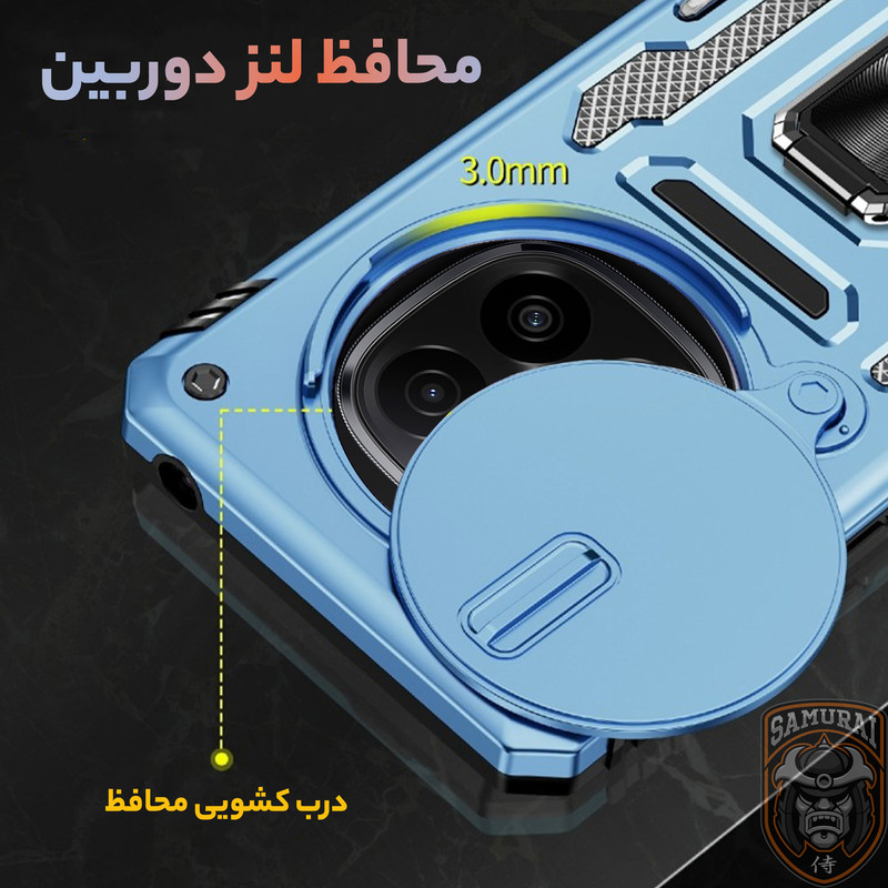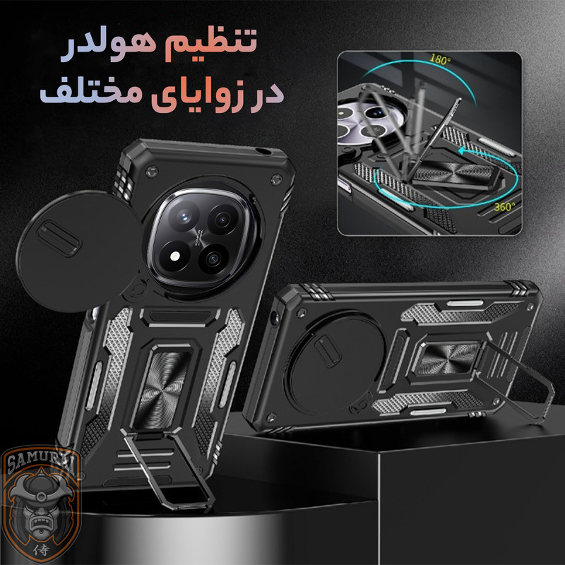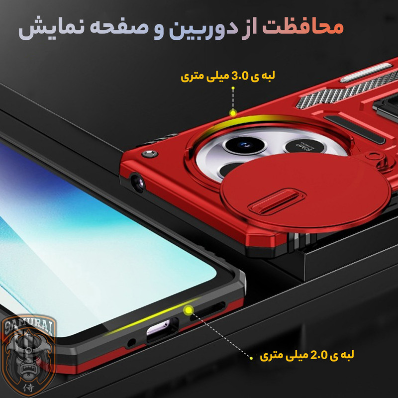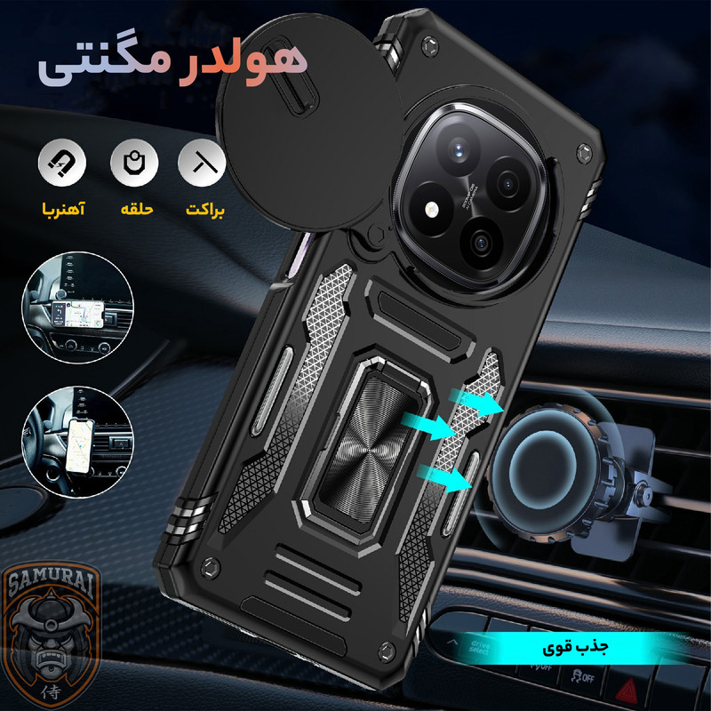 کاور جدید سامورایی سری Katso به گونه ای طراحی شده است که همه لبه های آن، با ارتفاع قابل توجهی گوشی را در بر گرفته و مانع از آسیب دیدن گوشی Xiaomi Redmi Note 14 Pro Plus شود. گرچه این قاب با لبه های ژله ای هر چهار طرف گوشی را پوشانده است، اما به دلیل انعطاف پذیری لبه ها، کاربران برای نصب و جداسازی این قاب روی گوشی زحمتی نخواهند داشت و فشاری به گوشی وارد نمی شود. ژله ای بودن دور کاور باعث میشد در صورت سقوط گوشی روی زمین شوک ناشی از ضربه در همه زوایای کاور پخش شده و آسیبی به گوشی وارد نشود. یکی از مهمترین ویژگی های این قاب وجود حلقه نگهدارنده در پشت قاب است که شما میتوانید از حلقه ای که به این قاب متصل است در موارد گوناگون استفاده کنید. برای نمونه با قرار دادن انگشت دورن حلقه، گوشی شیائومی Redmi Note 14 Pro Plus کاملا در دست محکم می شود و احتمال افتادن گوشی از دست از بین میبرد. یا میتوانید با چرخاندن حلقه کاور را به حالت استند در بیاورید و به تماشای فیلم بپردازید. همچنین این حلقه نگهدارنده با داشتن حالت آهن ربایی می تواند به خوبی روی هولدرهای آهنربایی داخل خودرو بچسبد و دیگر نیازی به استفاده از برچسبهای آهن ربایی مجزا نخواهید داشت. این قاب دارای یک اسلاید کشویی است که به خوبی از دوربین محافظت می کند. همچنین در اطراف لنز های دوربین مقداری برجستگی وجود دارد که می تواند از دوربین گوشی هنگام ضربه محافظت کند.