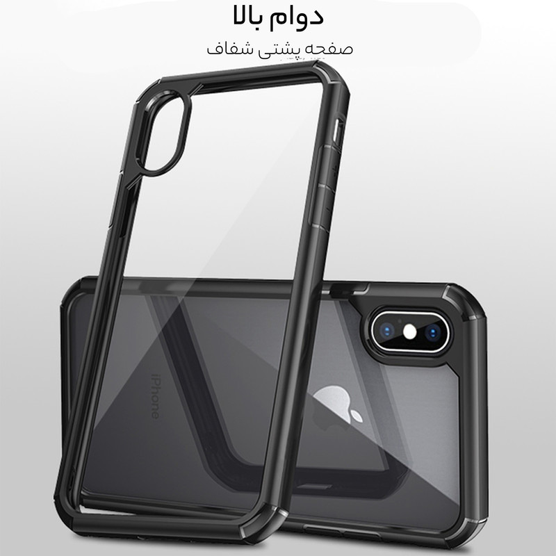 کاور گوشی اپل iPhone X / XS سری Shock Proof Case محافظی ساده است که به دور از هر گونه زرق و برق از گوشی شما در برابر ضربه و سقوط به خوبی محافظت می کند. روکش قاب کاملا صاف و یکدست بوده و احساس خوشایندی به کاربر در هنگام کار با گوشی منتقل میکند. سطح و جنس کاور از پلاستیک با کیفیت و نسبتا نرمی ساخته شده است که به راحتی گوشی درون کاور جای گرفته و هنگام کار محدودیتی برای کار با دوربین، پورت ها و دکمه ها نخواهید داشت. ساختار این قاب از دو بخش به هم پیوند خورده تشکیل شده است. بخش اول بدنه ی اصلی قاب است که با نمای شفاف خود پشت گوشی را می پوشاند و از گوشی شما در برابر خط و خش و ضربات احتمالی حفاظت میکند. بخش دوم بامپری است که با ایجاد لایه ای ضخیم تر، دورتادور گوشی را پوشانده و آن را در برابر سقوط و ضربه های شدید ایمن نگه می دارد.