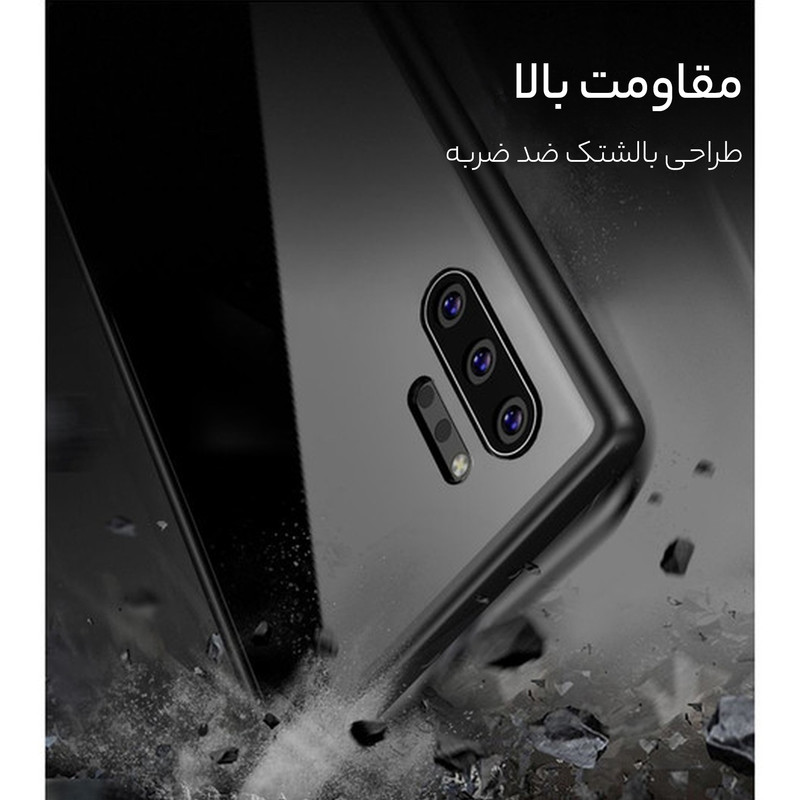 کاور سامورایی سری Glass Case مناسب برای گوشی موبایل سامسونگ Galaxy Note 10 Plus در رنگ های متفاوت برای انواع سلیقه ها طراحی شده است. این قاب از سه قسمت اصلی بامپر سیلیکونی، پنل پلی کربنات و شیشه فشرده شده تشکیل شده که مجموعا یک قاب 360 درجه را عرضه می کنند. ویژگی ای که این کاور را متمایز می کند جنس شیشه ای و آیینه مانند پشت آن است که می تواند جذابیت گوشی لوکس شما را دو چندان کند. شیشه فشرده شده که قسمت بیرونی قاب را تشکیل می دهد جنس بسیار با کیفیتی دارد و لمس آن تضمین کننده این امر است. همچنین شیشه پشت کاور مقاومت بالایی در برابر خط و خش دارد و به سختی می توان بر روی آن خراش ایجاد کرد. بامپر سیلیکونی دور کاور نیز روی دکمه ها را پوشانده که علاوه بر محافظت از دکمه ها استفاده از آن ها را راحت تر می کند.