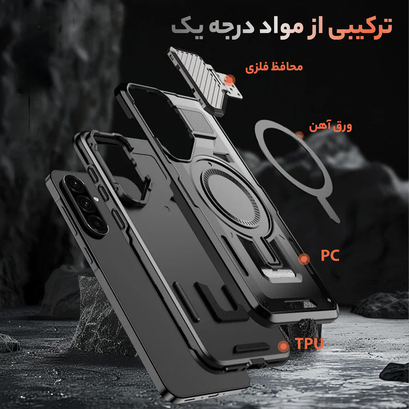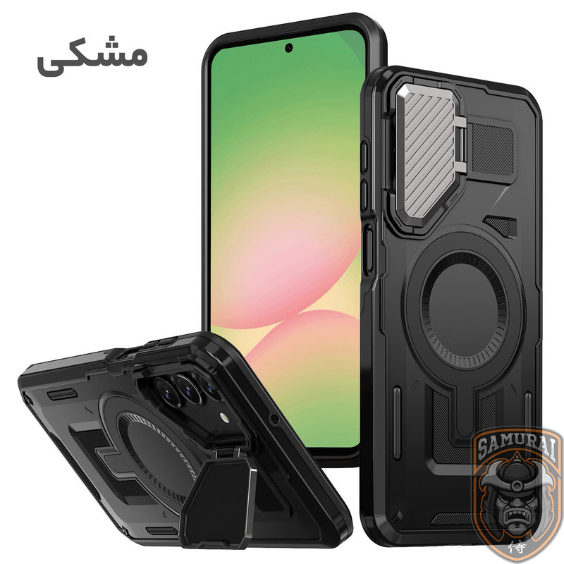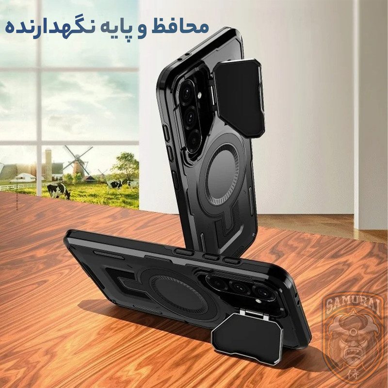 قاب گوشی سامسونگ گلکسی A56 برند سامورایی مدل Predator دارای درپوش دوربین دوکاره است که بهعنوان پایه نگهدارنده نیز عمل میکند و امکان تماشای ویدیو را فراهم میسازد. این قاب مجهز به حلقه مغناطیسی قوی برای شارژ بیسیم و اتصال به لوازم جانبی مغناطیسی است. ترکیب مواد TPU نرم و PC سخت، محافظتی در سطح نظامی در برابر ضربه و خط و خش برای گوشی موبایل Samsung Galaxy A56 فراهم میکند. طراحی دقیق آن با برشهای مناسب برای دکمهها و پورتها، کاملاً با گوشی سازگار است.