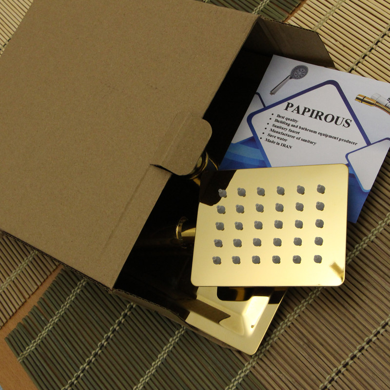 جنس استیل ضد زنگ، پوشش طلایی تحت خلا، دارای واشر توری دار جهت حذف رسوبات آب، سایز اتصالات استاندارد و قابل اتصال به تمامی لوله های دوش و شلنگ دوش استاندارد.