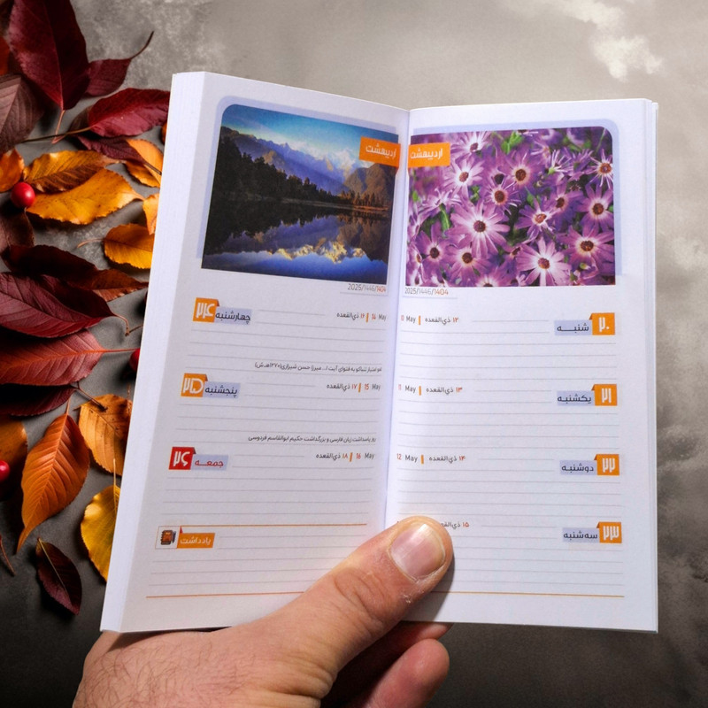 -سایز این تقویم جیبی حدود 15 در 8 سانتیمتر میباشد . -امکان یادداشت موارد مهم روزانه در قسمت پایین همان روز به جهت یادآوری