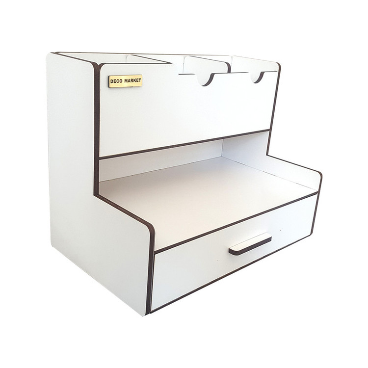 استند لوازم اداری دکو مارکت مدل 1089 دارای یک کشو و قسمتی برای قرار گرفتن انواع رژ و عطر و ادکلن در نظر گرفته شده است.این استند مورد استفاده برای نظم دادن به لوازم آرایشی، لوازم تحریر، ابزارآلالت مختلف، وسایل خیاطی و تمام وسایلی که همواره بی نظمی روی میز ایجاد میکند قابل استفاده است. این استند طراحی و تولید شده در مجموعه دکو مارکت میباشد که از چوب ام دی اف روکش دار در رنگهای مختلف بصورت 2 لایه برای استحکام بیشتر محصول ساخته شده است. لازم به ذکر است این محصول را می توان به صورت یک لایه و با ضخامت 3 میلی متر نیز ساخت که در نتیجه جنس مصرفی و زمان ساخت و هزینه های تولید کننده نصف می شود اما گروه تولیدی دکو مارکت کیفیت و ماندگاری را سرلوحه تولیدات خود قرار داده است. از برخی ویژگی های مهم این استند آرایشی می توان به ضخامت مناسب (دولایه چوب 3 میل روی هم 6 میل)، استحکام بالا، وزن کم، اشغال فضای کم نام برد.