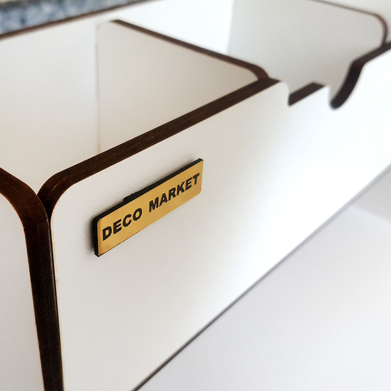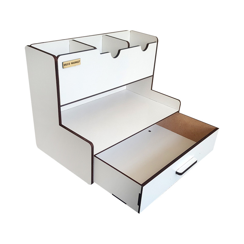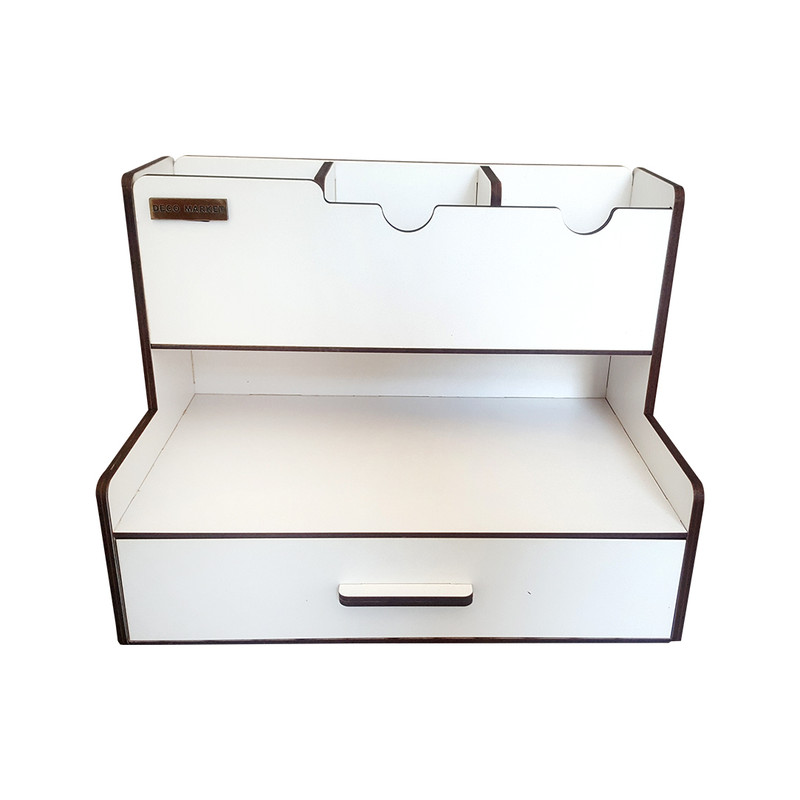 استند لوازم اداری دکو مارکت مدل 1089 دارای یک کشو و قسمتی برای قرار گرفتن انواع رژ و عطر و ادکلن در نظر گرفته شده است.این استند مورد استفاده برای نظم دادن به لوازم آرایشی، لوازم تحریر، ابزارآلالت مختلف، وسایل خیاطی و تمام وسایلی که همواره بی نظمی روی میز ایجاد میکند قابل استفاده است. این استند طراحی و تولید شده در مجموعه دکو مارکت میباشد که از چوب ام دی اف روکش دار در رنگهای مختلف بصورت 2 لایه برای استحکام بیشتر محصول ساخته شده است. لازم به ذکر است این محصول را می توان به صورت یک لایه و با ضخامت 3 میلی متر نیز ساخت که در نتیجه جنس مصرفی و زمان ساخت و هزینه های تولید کننده نصف می شود اما گروه تولیدی دکو مارکت کیفیت و ماندگاری را سرلوحه تولیدات خود قرار داده است. از برخی ویژگی های مهم این استند آرایشی می توان به ضخامت مناسب (دولایه چوب 3 میل روی هم 6 میل)، استحکام بالا، وزن کم، اشغال فضای کم نام برد.
