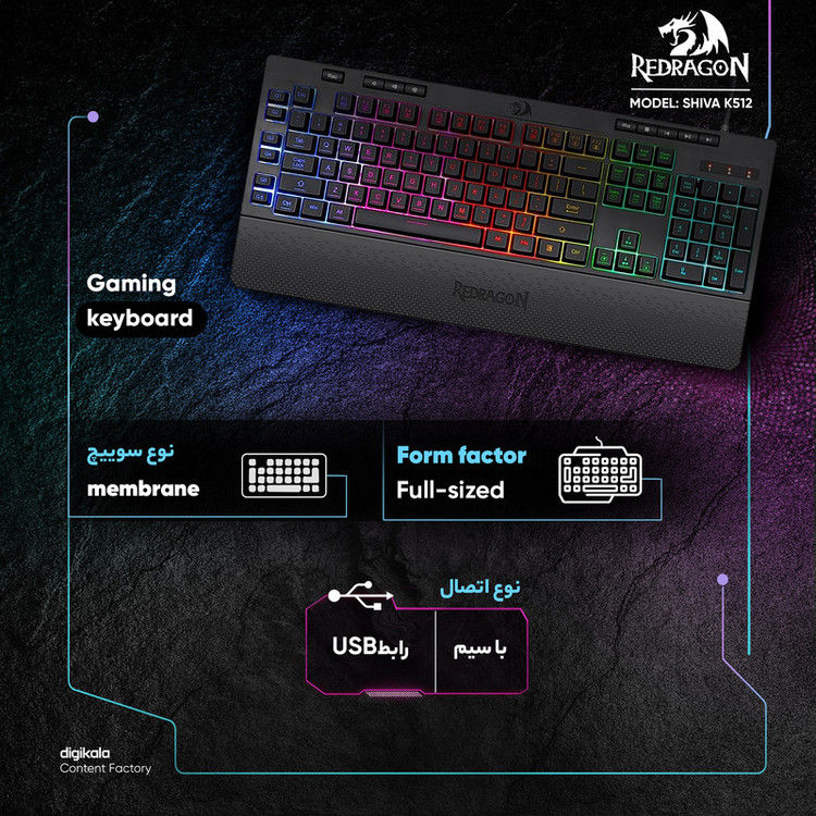 کیبورد گیمینگ ردراگون مدل Shiva K512، سوییچ ممبران، Full-Size، نورپردازی RGB