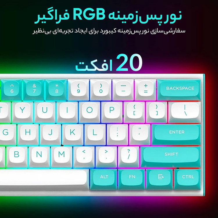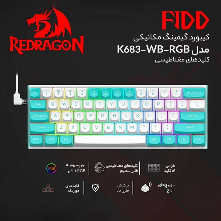 کیبورد مکانیکال گیمینگ ردراگون Fidd K683 WB RGB با طراحی فشرده و رنگارنگ خود، یک انتخاب عالی برای گیمرهایی است که به دنبال کیبوردی کمحجم و زیبا هستند. این کیبورد با ابعاد 12.6 × 5.51 × 0.18 اینچ و وزن 1.32 پوند، بسیار سبک و جمعوجور است. رنگبندی جذاب ترکیبی از فیروزهای و سفید، ظاهری تازه و متفاوت به این کیبورد میبخشد که در مقایسه با طرحهای معمولی گیمینگ، چشمگیرتر است. کیبورد Fidd K683 WB از سوئیچهای مغناطیسی خطی ردراگون استفاده میکند که عملکردی نرم و بیصدا دارند. این سوئیچها با تکنولوژی Hall Effect، به شما امکان میدهند که دقت بالایی در فشردن کلیدها داشته باشید. این سوئیچها با مقاومت کمتر و حرکت کوتاهتر، تایپ و بازی را سریعتر و دقیقتر میکنند. همچنین، این تکنولوژی به ردراگون امکان ارائه ویژگیهای جذابی مانند نقاط فعالسازی سفارشی و Rapid Trigger را میدهد که واکنشپذیری کلیدها را بهبود میبخشند. کیبورد Fidd K683 WB با نورپردازی RGB برای هر کلید، تجربهی بصری شما را بهبود میبخشد. این کیبورد با 20 حالت نورپردازی مختلف، به شما امکان میدهد که محیط بازی خود را به دلخواه تنظیم کنید. همچنین، میتوانید روشنایی و سرعت جریان نور را تنظیم کنید تا جلوهای منحصر به فرد به کیبورد خود ببخشید.