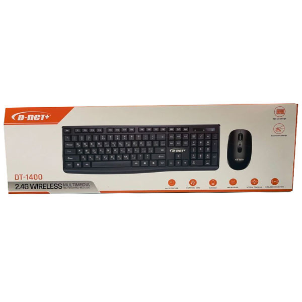 محصول «DT-1400» شرکت «دی نت» (D-NET) شامل یک ماوس و یک کیبورد بیسیم است. این محصول دارای طراحی رضایتبخش و کیفیت ساخت مطلوب است و نیازهای خانگی و اداری را پاسخگو است. کیبورد این مجموعه از طراحی ساده و و کلاسیکی برخوردار است و کلیدهایی با طول عمر بیش از 500 هزار بار ضربه دارد. این کیبورد انرژی خود را از یک باتری نیم قلمی (سایز AAA) تأمین میکند. ماوس DT-1400 نیز مانند یک ماوس کلاسیک است و ظاهری ساده دارد. طراحی این محصول دی نت به گونهای است که افراد چپدست و راستدست میتوانند از آن استفاده کنند . توان مورد نیاز ماوس این مجموعه از طریق یک عدد باتری قلمی (سایز AA) تأمین میشود . استفاده از این ماوس و کیبورد بسیار راحت است و نیاز به هیچگونه نصب و راهاندازی ندارد و با تمام سیستم عاملهای رایج سازگاری کامل دارد . درمجموع میتوان D-NET DT-1400 را یک مجموعهی مناسب و مقرون به صرفه برای مصارف روزمره دانست.