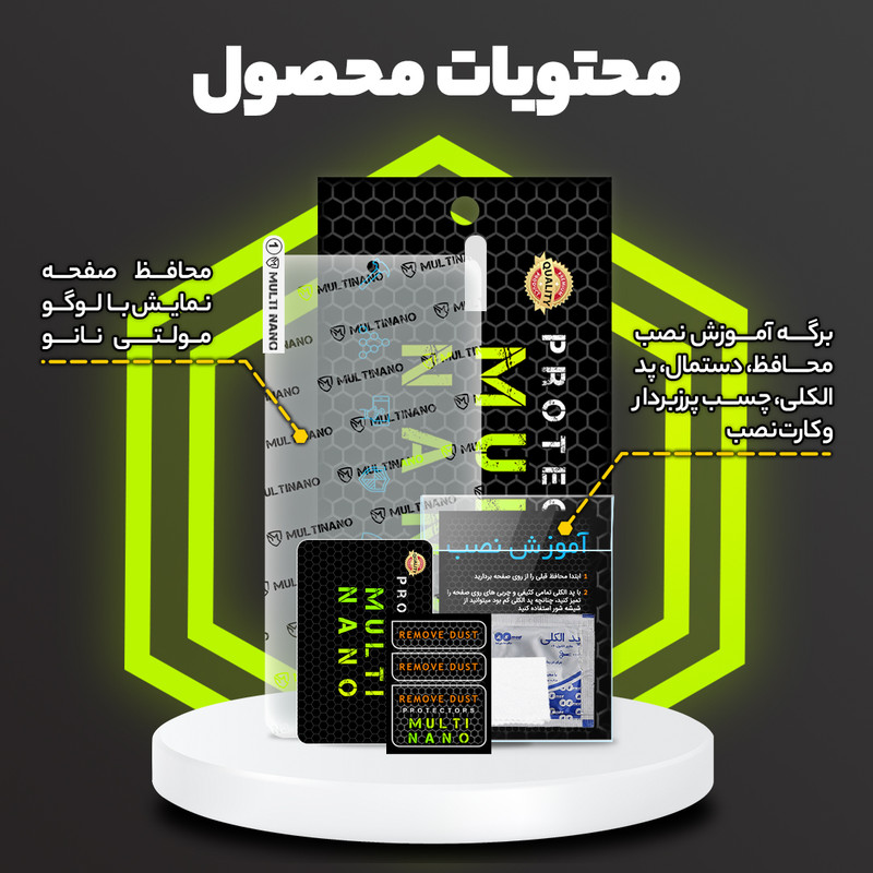 اقلام همراه : شامل یک عدد محافظ صفحه نمایش مات - پد الکلی - برچسب پرز بردار - دستمال مناسب برای تمیز کردن گوشی - کارت نصب - آموزش نصب ویدئویی