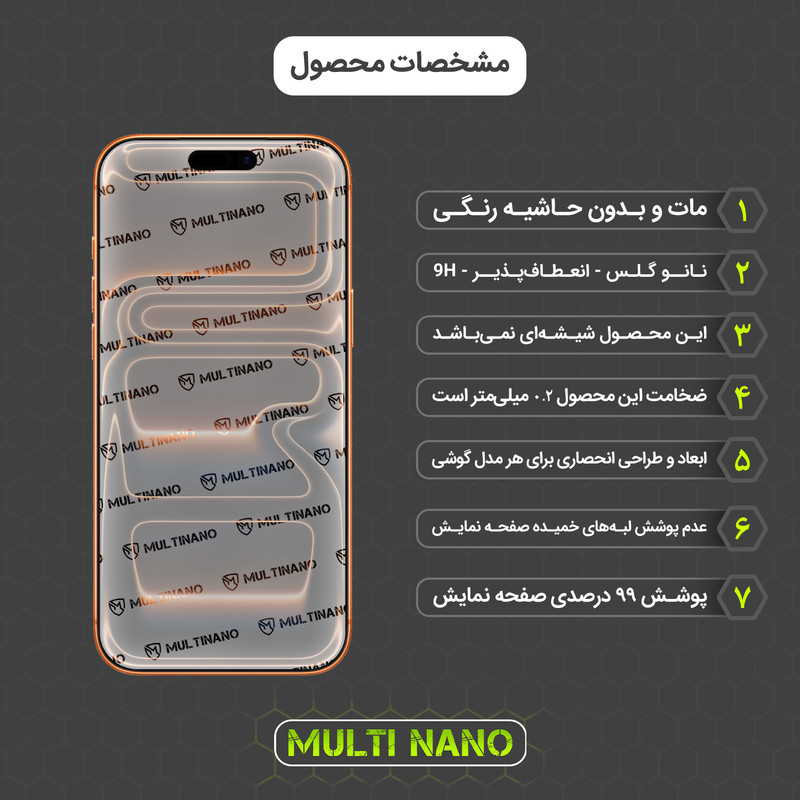 ویژگی‌ها : 9H , مقاوم در برابر چربی و اثرانگشت , مقاوم در برابر خط و خش , جلوگیری از انعکاس نور