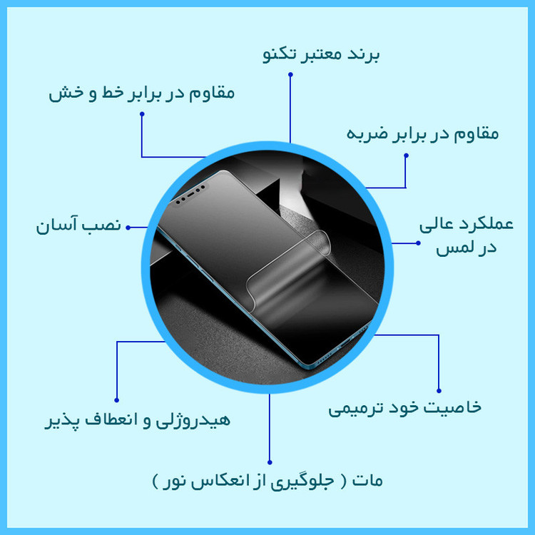 محافظ صفحهنمایشهای مات هیدروژلی تکنو، حفاظتی مطمئن برای دستگاه شما فراهم میکند. با این محافظ، میتوانید از خط و خشهای ناخواسته بر روی صفحهنمایشتان جلوگیری کنید و تجربهی استفادهی بینقصی را به دست آورید. این محصول با داشتن ویژگیهایی چون، خودترمیم بودن، مات کردن صفحه جهت جلوگیری از انعکاس نور، عدم جذب چربی و آلودگی، نصب آسان، یکدست و بدون حاشیه رنگی، برند معتبر تکنو و کیفیت بالا، انتخابی عالی برای حفاظت از دستگاههای الکترونیکی شماست. حتما قبل از نصب کلیپ آموزشی را در اینترنت مشاهده فرمایید. یاداور میشود برای دستگاه هایی که قفل اثر انگشت بر روی صفحه قرار دارد، لازم است بعد از نصب این محافظ، اثر انگشت قبلی معرفی شده را حذف و مجدد تعریف نمایید.