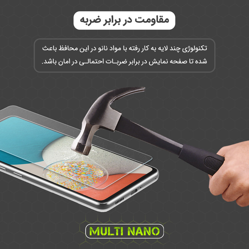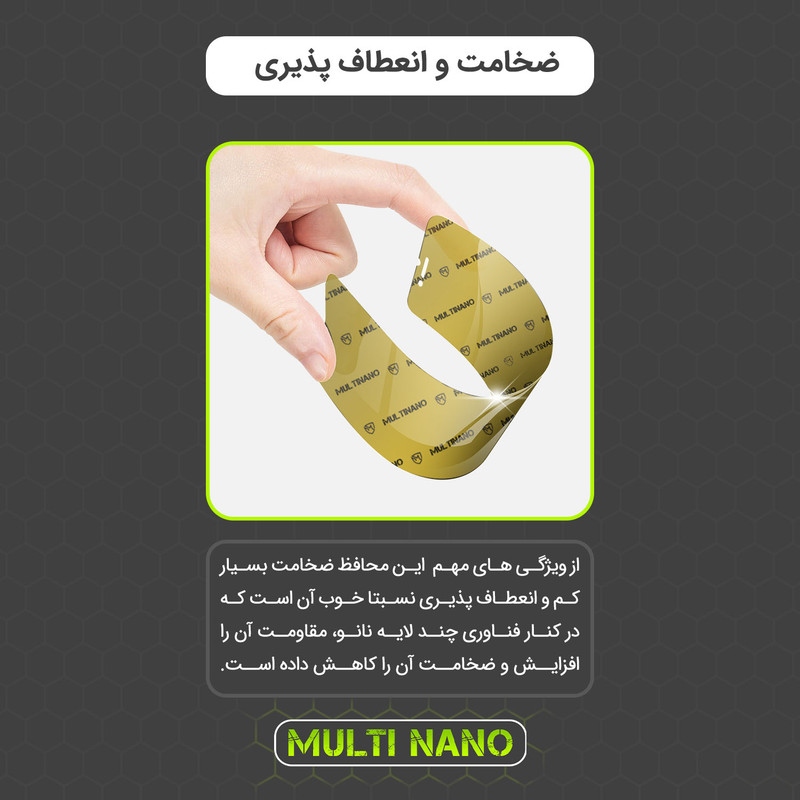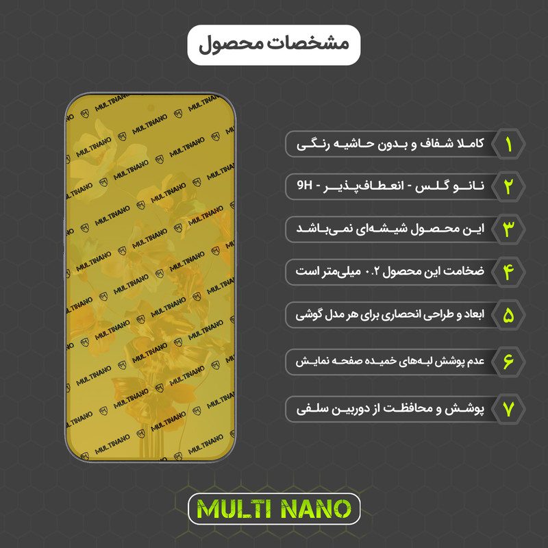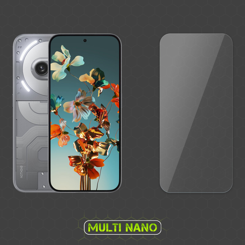 محافظ صفحه نمایش نانو Multi Nano ، گلسی باساختار شفاف و بدون حاشیه رنگی که توسط فناوری نانو ساخته شده و از ضخامت 0.2 میلی متری برخوردار است.(شیشه ای نمی باشد) و باعث مقاومت بسیار بیشتر در برابر ضربه نسبت به گلس های معمولی شده است همچنین کاملا نشکن است و در صورت برخورد ضربه نخواهد شکست بسیار شفاف است و به مرور زمان کدر نخواهد شد و لمس آن با توجه به ساختار تکنولوژی روغنی، بسیار آسان و روان است و از صفحه نمایش گوشی موبایل (ناتینگ فون 2 ای پلاس) در برابر ضربات احتمالی , خط و خش و... محافظت میکند.محافظ صفحه نمایش نانو مولتی نانو قسمت های خمیده (curved) صفحه گوشی را پوشش نمیدهد اما برای گوشی هایی که خمیدگی ندارند، صفحه نمایش را به خوبی پوشش میدهد.همچنین قسمت دوربین سلفی برای محافظت هرچه بهتر از صفحه نمایش و نظافت راحت تر پوشش داده شده و تداخلی در عملکرد دوربین یا سنسورهای مجاور ندارد.با توجه به ضخامت کم این محصول نسبت به گلس های 3 میل، برای گوشی هایی که حسگر اثر انگشت آن روی صفحه نمایش تعبیه شده اند، نیز پیشنهاد میشود.