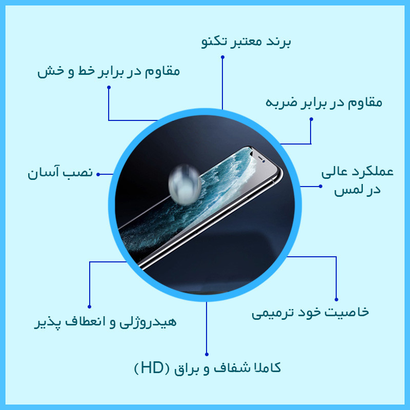 برند معتبر تکنو – یکدست و بدون حاشیه رنگی - خودترمیم - تشخیص سریع اثر انگشت - سرعت تاچ بالا - نصب آسان - کیفیت بالا - کاملا شفاف - قبل از نصب کلیپ آموزشی را در اینترنت مشاهده فرمایید