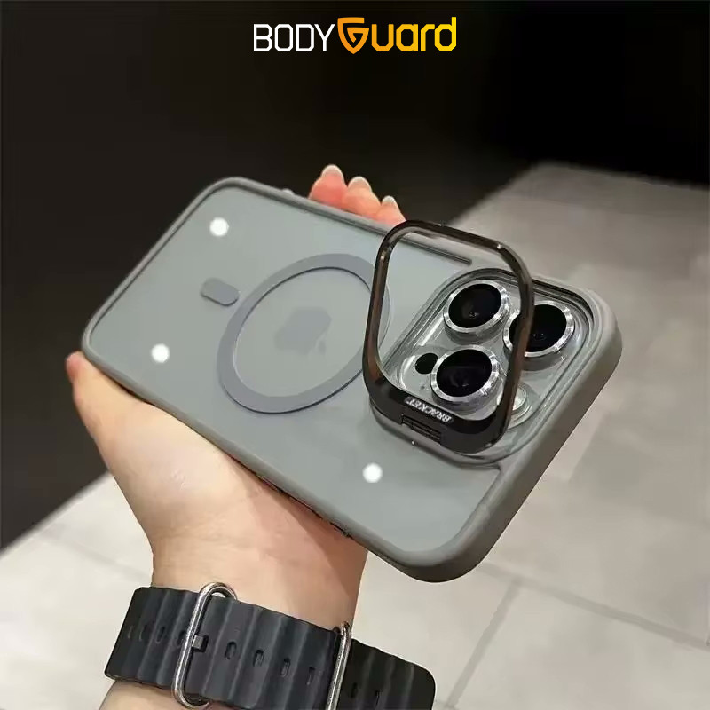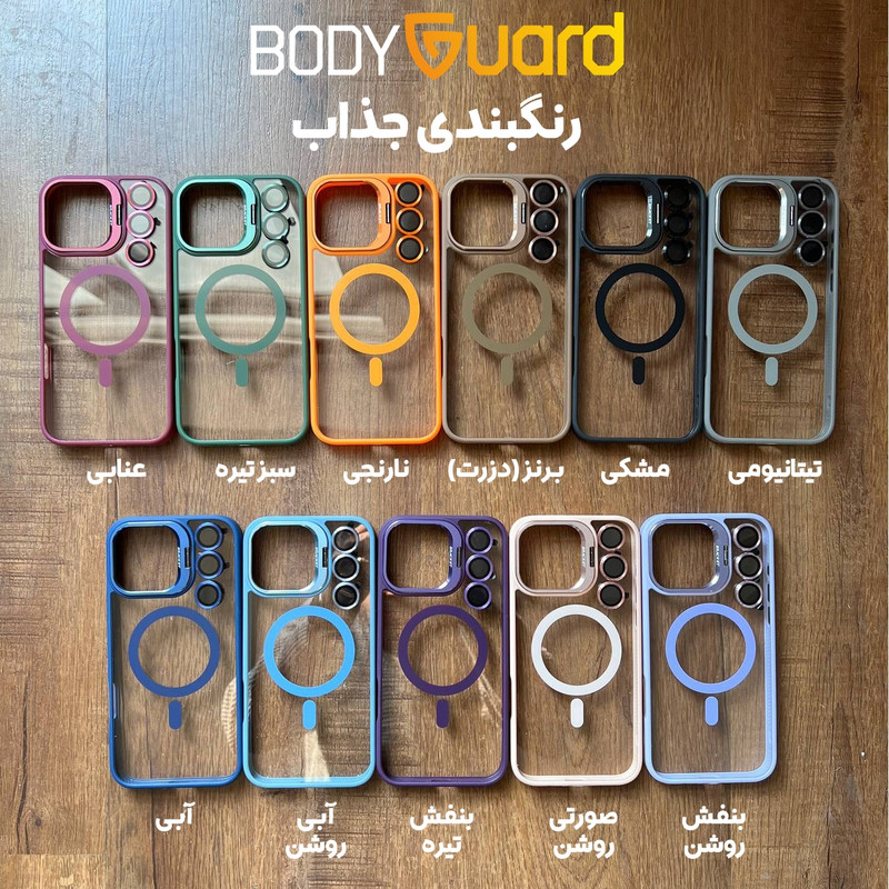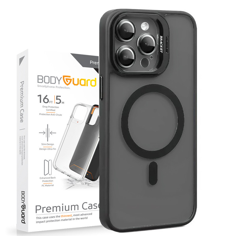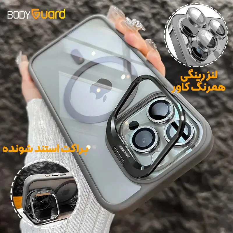 قاب مدل Bracket محصول جدید بادیگارد می باشد. این کاور علاوه بر ظاهر جذاب از کارآیی مناسبی نیز برخوردار می باشد. این کاور در قسمت دوربین دارای یک براکت می باشد که قابلیت تبدیل شدن به استند برای تماشای محتوای تصویری را به کاور اضافه می کند. همچنین این کاور از تمام محصولات Magsafe پشتیبانی می کند. این کاور به همراه محافظ دوربین رینگی همرنگ با کاور عرضه می شود.