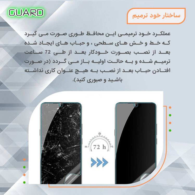 - محافظت کامل از صفحه نمایش: گلسهای هیدروژلی شفاف گارد به طور کامل صفحه نمایش گوشی شما را پوشش میدهند و از تمام نقاط آن محافظت میکنند