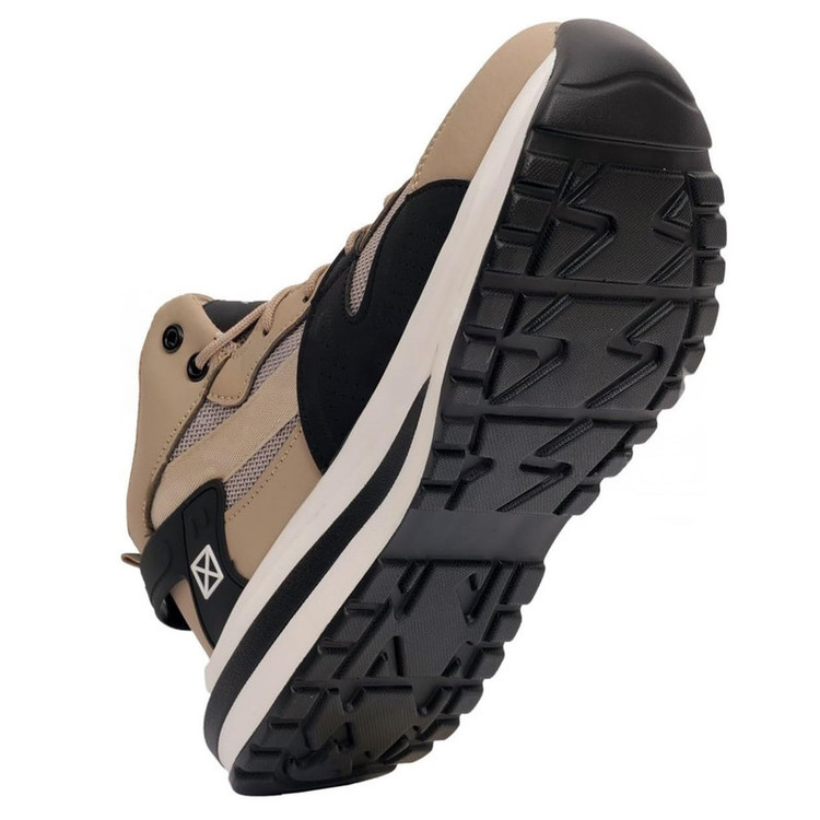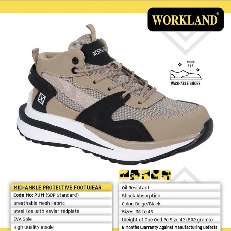 این مدل کفش متعلق به برند WORKLAND تولید شده در کشور چین می باشد . وزن این کفش با توجه به نیم ساق بودن آن نسبتا سبک بود و هر لنگه آن ( سایز 42 ) 515گرم وزن دارد . طراحی آن بسیار اسپرت و ظریف بوده و اصلا در نگاه اول کفش ایمنی بنظر نمی رسد . جنس رویه آن ترکیبی از چرم جیر و پارچه بافت مش تنفس پذیر با طراحی بسیار زیبا و چشمگیر می باشد . سرپنجه این کفش از جنس استیل است . زیره کفش از جنس PU , آنتی شوک ( SHOCK ABSORPTION جاذب ضربه ) در قسمت پاشنه پا و ضد لغزش بوده و منعطف و همچنین مقاوم در برابر روغن و مشتقات نفتی می باشد . ساق کفش بصورت نیم ساق بوده و قوزک پا را بخوبی پوشش می دهد .